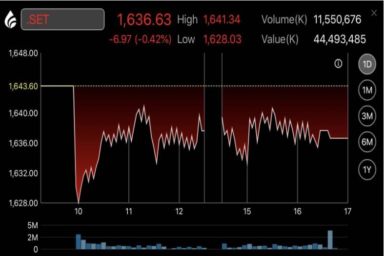 - ตลาดหุ้นไทยวันที่ 11 ก.ค. เคลื่อนไหวในแดนลบตลอดทั้งวัน เป็นไปในทิศทางเดียวกันกับตลาดหุ้นในภูมิภาค หลังนักลงทุนยังกังวลสงครามการค้าสหรัฐกับจีน กลับมาเข้มข้นขึ้นอีกครั้ง หลังผู้แทนการค้าสหรัฐได้ออกมาระบุว่า รัฐบาลสหรัฐจะเรียกเก็บภาษีนำเข้าสินค้าจากจีนเพิ่มอีก 200,000 ล้านดอลลาร์ โดยจะเรียกเก็บในอัตรา 10% ตั้งแต่สินค้าเพื่อผู้บริโภคไปจนถึงสินค้าด้านการเกษตร ทั้งนี้ ยังต้องรอดูความคืบหน้าเกี่ยวกับสงครามการค้า แต่ที่ผ่านมาตลาดได้ตอบรับเรื่องนี้มาในระดับหนึ่งแล้ว นอกจากนี้ ต้องติดตามผลประกอบการกลุ่มธนาคารพาณิชย์อย่างใกล้ชิด ส่งผลให้ปิดตลาดที่ 1,636.63 จุด ลดลง 6.97 จุด หรือ 0.42% ด้วยมูลค่าการซื้อขาย 44,493.49 ล้านบาท