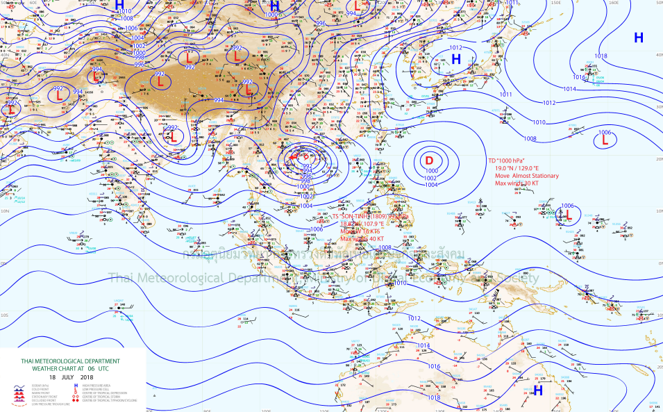 - ประเทศไทยมีฝนตกชุกหนาแน่น กับมีฝนตกหนักถึงหนักมากบางแห่ง โดยเฉพาะบริเวณภาคเหนือ มีเมฆเป็นส่วนมาก กับมีฝนฟ้าคะนอง ร้อยละ 80 ของพื้นที่ และมีฝนตกหนักถึงหนักมากบางแห่ง ส่งผลให้อุณหภูมิลดต่ำลงถึง 23 – 25 องศาเซลเซียส ภาคตะวันออกเฉียงเหนือ มีเมฆมาก กับมีฝนตกเป็นบริเวณกว้าง และมีฝนตกหนักหลายพื้นที่ กับมีฝนตกหนักมากบางแห่ง ภาคใต้ มีเมฆเป็นส่วนมาก กับมีฝนฟ้าคะนอง ร้อยละ 70 ของพื้นที่ และมีฝนตกหนักบางแห่ง ทะเลมีคลื่นสูง 1-2 เมตร บริเวณที่มีฝนฟ้าคะนองคลื่นสูงมากกว่า 2 เมตร ภาคกลางและภาคตะวันออก มีเมฆเป็นส่วนมาก กับมีฝนฟ้าคะนอง ร้อยละ 70 ของพื้นที่ ทั้งนี้ ขอให้ประชาชนระวังผลกระทบจากฝนตกหนักและฝนที่ตกสะสม ที่ทำให้เกิดน้ำท่วมฉับพลันและน้ำป่าไหลหลากไว้ด้วย ส่วนประชาชนที่อาศัยอยู่บริเวณชายฝั่งภาคตะวันออกและภาคใต้ ระวังอันตรายจากคลื่นลมแรงที่พัดเข้าหาฝั่งจนถึงวันที่ 22 กรกฎาคม 2561