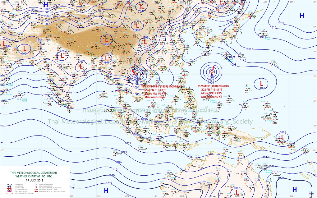 - ประเทศไทยมีฝนตกชุกหนาแน่น กับมีฝนตกหนักถึงหนักมากบางแห่งบริเวณภาคเหนือ ภาคตะวันออกเฉียงเหนือ ภาคตะวันออก และภาคใต้ ขอให้ประชาชนระวังผลกระทบจากฝนตกหนักและฝนที่ตกสะสม ที่ทำให้เกิดน้ำท่วมฉับพลันและน้ำป่าไหลหลาก สำหรับคลื่นลมบริเวณทะเลอันดามันและอ่าวไทยตอนบนมีกำลังแรง โดยมีคลื่นสูง 2-3 เมตร บริเวณที่มีฝนฟ้าคะนองคลื่นสูงมากกว่า 3 เมตร ขอให้ชาวเรือเดินเรือด้วยความระมัดระวัง เรือเล็กควรงดออกจากฝั่ง ส่วนประชาชนที่อาศัยอยู่บริเวณชายฝั่งภาคตะวันออกและภาคใต้ฝั่งตะวันตก ระวังอันตรายจากคลื่นลมแรงที่พัดเข้าหาฝั่งจนถึงวันที่ 22 กรกฎาคม 2561 โดยพยากรณ์อากาศสำหรับประเทศไทยตั้งแต่เวลา 17:00 วันนี้ ถึง 17:00 วันพรุ่งนี้ ภาคเหนือ มีเมฆเป็นส่วนมาก กับมีฝนฟ้าคะนอง ร้อยละ 80 ของพื้นที่ และมีฝนตกหนักถึงหนักมากบางแห่ง อุณหภูมิต่ำสุด 22-24 องศาเซลเซียส และ อุณหภูมิสูงสุด 27-33 องศาเซลเซียส ภาคตะวันออกเฉียงเหนือ มีเมฆมาก กับมีฝนตกเป็นบริเวณกว้าง และมีฝนตกหนักถึงหนักมากบางแห่ง อุณหภูมิต่ำสุด 22-24 องศาเซลเซียส และอุณหภูมิสูงสุด 28-30 องศาเซลเซียส ภาคใต้ มีเมฆเป็นส่วนมาก กับมีฝนฟ้าคะนอง ร้อยละ 70 ของพื้นที่ อุณหภูมิต่ำสุด 22-24 องศาเซลเซียส และอุณหภูมิสูงสุด 30-34 องศาเซลเซียส ทะเลมีคลื่นสูง 1-2 เมตร ส่วนบริเวณที่มีฝนฟ้าคะนองจะมีคลื่นสูงมากกว่า 2 เมตร ภาคกลางและภาคตะวันออก มีเมฆเป็นส่วนมาก กับมีฝนฟ้าคะนอง ร้อยละ 70 ของพื้นที่ อุณหภูมิต่ำสุด 23-25 องศาเซลเซียส และอุณหภูมิสูงสุด 29-31 องศาเซลเซียส