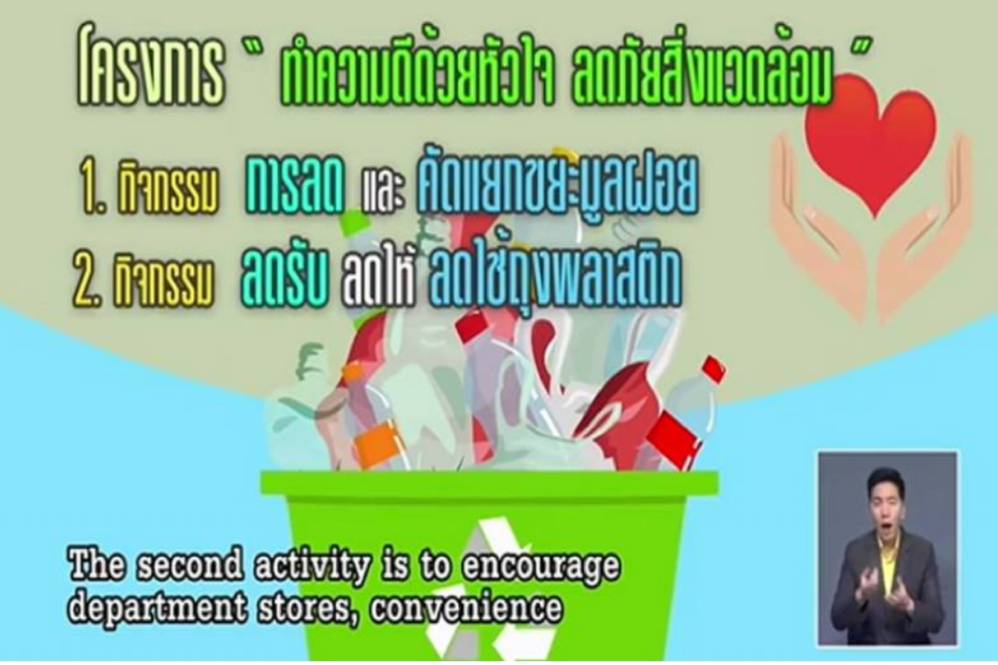 - นรม. และ หน.คสช. (พล.อ.ประยุทธ์ฯ) กล่าวผ่านรายการ“ศาสตร์พระราชา สู่การพัฒนาอย่างยั่งยืน” ตอนหนึ่งว่า เนื่องจาก 20 ปีที่ผ่านมาประเทศไทยมีการใช้ถุงพลาสติกหูหิ้ว จำนวน 45,000 ล้านใบต่อปี โฟมบรรจุอาหาร เกือบ 7,000 ล้านใบต่อปี แก้วพลาสติกแบบใช้ครั้งเดียว เกือบ 10,000 ล้านใบต่อปี ซึ่งเป็นวัสดุที่ย่อยสลายยาก หากไม่มีการบริหารจัดการที่ถูกต้องเหมาะสมจะส่งผลกระทบที่เกินกว่าจะควบคุมดูแล ซึ่งประเทศไทยถูกระบุว่ามีปัญหาขยะทางทะเลเป็นอันดับ 6 ของโลก ดังนั้น รัฐบาลขอรณรงค์ลดขยะและพลาสติก รวมถึงขยายผลในการลดใช้ถุงพลาสติกหูหิ้วและโฟมบรรจุอาหารภายใต้โครงการ “ทำความดีด้วยหัวใจ ลดภัยสิ่งแวดล้อม” พร้อมกันทั่วประเทศตั้งแต่วันที่ 1 ส.ค. ในหน่วยงานภาครัฐ เพื่อเป็นแบบอย่างแก่ประชาชนและภาคเอกชน ส่วนในตลาดสดจะเริ่มพร้อมกันทั่วประเทศในวันที่ 21 ก.ค. นี้ ในการลดรับ ลดให้ ลดใช้ถุงพลาสติก