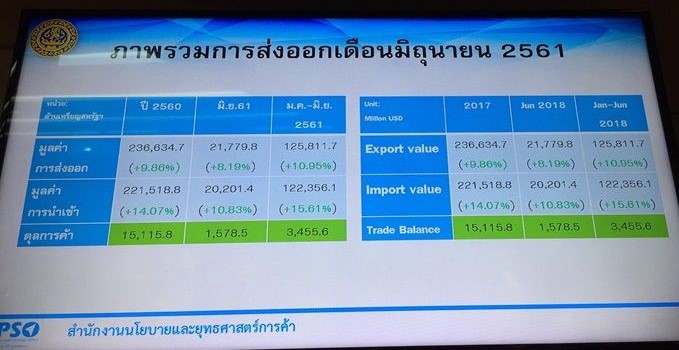 นางสาวพิมพ์ชนก วอนขอพร ผู้อำนวยการสำนักงานนโยบายและยุทธศาสตร์การค้า กล่าวว่า การส่งออกเดือนมิ.ย.2561 มีมูลค่า 21,779 ล้านดอลลาร์สหรัฐ เพิ่มขึ้น 8.19% ส่วนการนำเข้ามีมูลค่า 20,201 ล้านดอลลาร์สหรัฐ เพิ่มขึ้น 10.83% ทำไทยเกินดุลการค้าเดือนมิถุนายน 2561 มูลค่า 1,578 ล้านดอลลาร์สหรัฐ