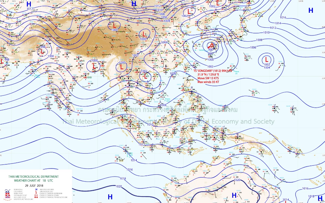 - ประกาศกรมอุตุนิยมวิทยา “คลื่นลมแรงบริเวณภาคใต้ และฝนตกหนักบริเวณประเทศไทยตอนบน” ฉบับที่ 8 ลงวันที่ 29 กรกฎาคม 2561 เวลา 23.00 น. ได้ประกาศว่า ในช่วงวันที่ 29-31 กรกฎาคม 2561 ประเทศไทยยังคงมีฝนตกชุกหนาแน่นและมีฝนตกหนักบางแห่งบริเวณภาคเหนือ ภาคตะวันออกเฉียงเหนือ ภาคกลาง ภาคตะวันออก และภาคใต้ ขอให้ประชาชนบริเวณดังกล่าวระวังผลกระทบจากฝนตกหนักและฝนตกสะสมที่ทำให้เกิดน้ำท่วมฉับพลันและน้ำป่าไหลหลากไว้ด้วย สำหรับคลื่นลมบริเวณทะเลอันดามันมีคลื่นสูง 2-4 เมตร และอ่าวไทยตอนบนมีคลื่นสูง 2-3 เมตร ขอให้ชาวเรือเดินเรือด้วยความระมัดระวังและเรือเล็กควรงดออกจากฝั่งในช่วงเวลาดังกล่าว สำหรับประชาชนที่อาศัยอยู่บริเวณชายฝั่งภาคใต้ฝั่งตะวันตก และภาคตะวันออกให้ระวังคลื่นที่พัดเข้าหาฝั่งไว้ด้วย ทั้งนี้ เนื่องจากหย่อมความกดอากาศต่ำปกคลุมบริเวณอ่าวตังเกี๋ยและประเทศเวียดนามตอนบน ประกอบกับมรสุมตะวันตกเฉียงใต้ที่พัดปกคลุมทะเลอันดามัน ภาคใต้ และอ่าวไทย มีกำลังแรง ลักษณะเช่นนี้ทำให้ประเทศไทยมีฝนตกชุกหนาแน่น กับมีฝนตกหนักบางแห่ง จึงขอให้ประชาชนติดตามประกาศจากกรมอุตุนิยมวิทยาอย่างใกล้ชิด