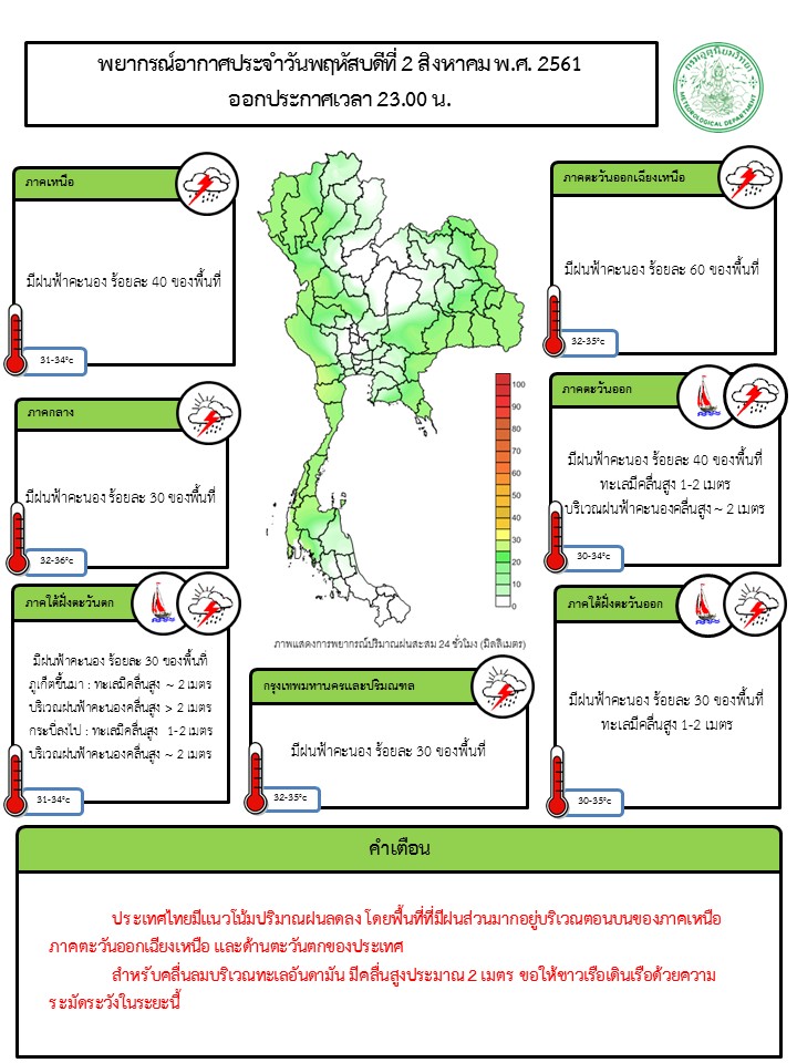 - พยากรณ์อากาศ 24 ชั่วโมงข้างหน้า ประเทศไทยมีแนวโน้มฝนลดลง โดยพื้นที่ที่มีฝนส่วนมากอยู่บริเวณตอนบนของภาคเหนือ ภาคตะวันออกเฉียงเหนือ และด้านตะวันตกของประเทศ สำหรับบริเวณทะเลอันดามัน มีคลื่นสูงประมาณ 2 เมตร ขอให้ชาวเรือเดินเรือด้วยความระมัดระวังในระยะนี้