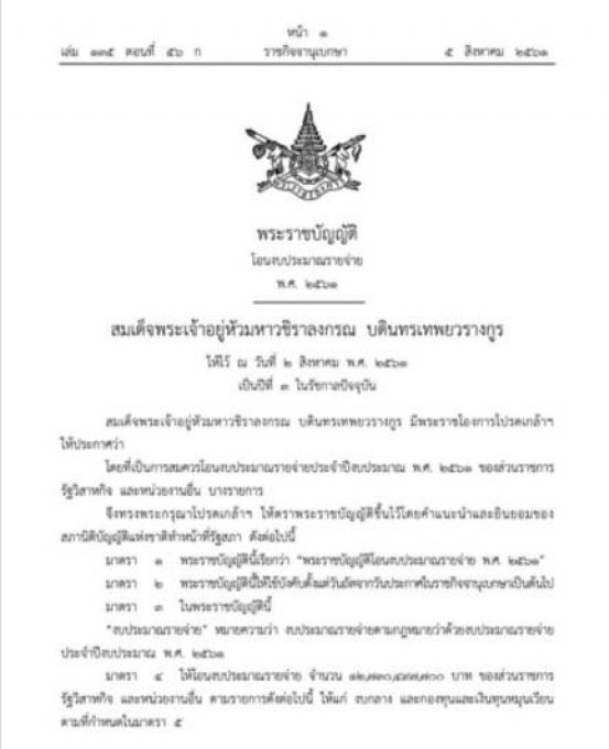 – พ.ร.บ. โอนงบประมาณรายจ่าย พ.ศ. 2561 ได้ตั้งงบประมาณไว้ทั้งหมดจำนวน 12,730,497,700 บาท แบ่งเป็นงบกลาง เงินสำรองจ่ายเพื่อกรณีฉุกเฉินหรือจำเป็น จำนวน 10,000,000,000 บาท และเป็นกองทุนประชารัฐ เพื่อเศรษฐกิจฐานราก 2,730,497,700 บาท