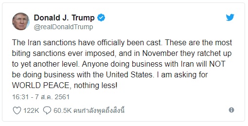 - สำนักข่าวต่างประเทศรายงานจากกรุงวอชิงตัน ประเทศสหรัฐอเมริกา เมื่อวันที่ 7 ส.ค. ว่าประธานาธิบดีโดนัลด์ ทรัมป์ ทวีตข้อความเมื่อวันอังคาร ว่าการกลับมาคว่ำบาตรอิหร่านโดยสหรัฐมีผลอย่างเป็นทางการแล้ว ซึ่งเป็นมาตรการคว่ำบาตรครั้งรุนแรงที่สุดเท่าที่เคยเกิดขึ้น และจะมีความรุนแรงยิ่งขึ้นกว่านี้ในเดือน พ.ย. โดยหมายถึงการเพิ่มแรงกดดันต่อภาคพลังงานของอิหร่าน พร้อมทั้งกล่าวด้วยว่า มาตรการคว่ำบาตรครั้งนี้เป็นไปเพื่อ “สันติภาพของโลก”