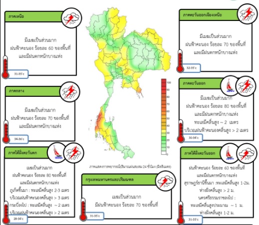 - ประเทศไทยมีฝนฟ้าคะนองหลายพื้นที่กับมีฝนตกหนักบางแห่งบริเวณภาคเหนือ ภาคตะวันออกเฉียงเหนือ ภาคกลาง ภาคตะวันออก และภาคใต้ ขอให้ประชาชนระวังอันตรายจากฝนตกหนักและฝนที่ตกสะสม อาจทำให้เกิดน้ำท่วมฉับพลันน้ำป่าไหลหลากไว้ด้วย สำหรับบริเวณทะเลอันดามันมีคลื่นสูง 2-3 เมตร อ่าวไทยตอนบนมีคลื่นสูงประมาณ 2 เมตร และบริเวณที่มีฝนฟ้าคะนองทะเลมีคลื่นสูงมากกว่า 3 เมตร กรุงเทพมหานครและปริมณฑลมีเมฆเป็นส่วนมากกับมีฝนฟ้าคะนอง ร้อยละ 70 ของพื้นที่ อุณหภูมิต่ำสุด 26-27 องศาเซลเซียส อุณหภูมิสูงสุด 31-35 องศาเซลเซียส