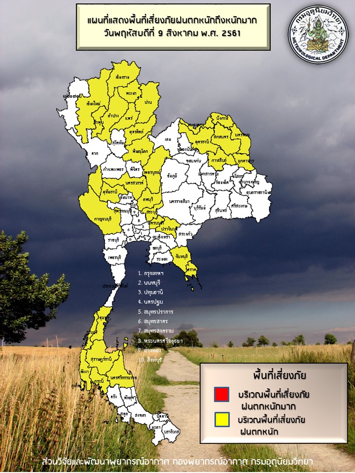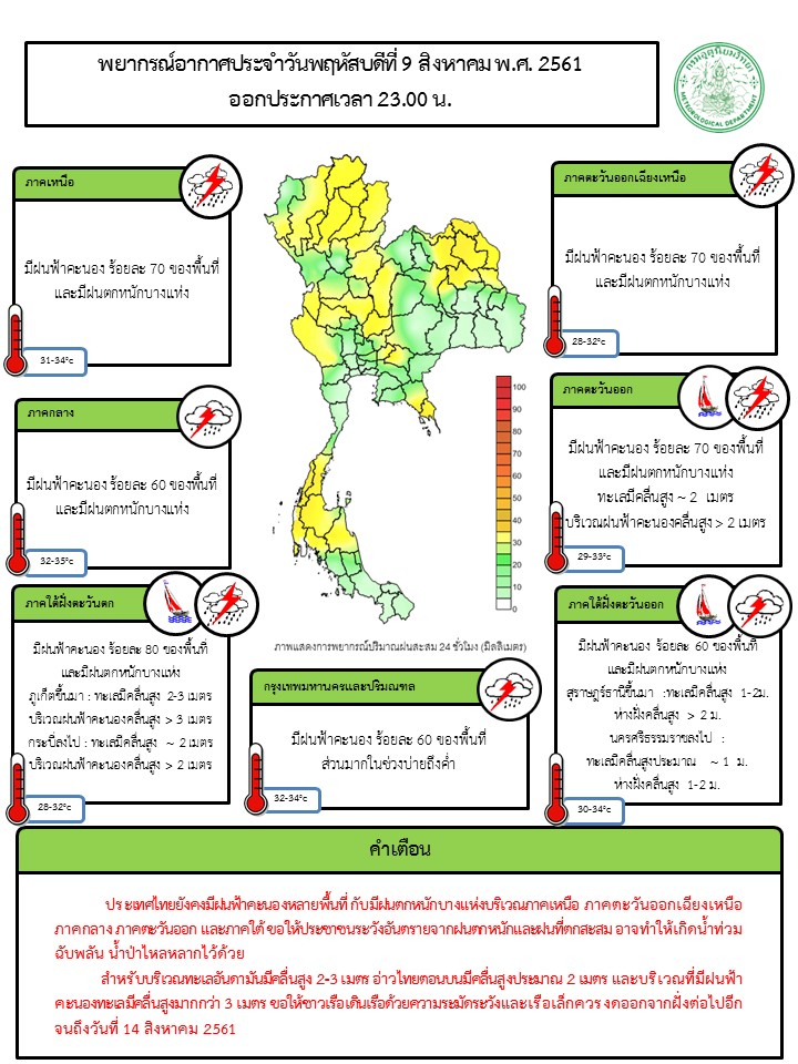- ประเทศไทยยังคงมีฝนฟ้าคะนองหลายพื้นที่ กับมีฝนตกหนักบางแห่งบริเวณภาคเหนือ ภาคตะวันออกเฉียงเหนือ ภาคกลาง ภาคตะวันออก และภาคใต้ ขอให้ประชาชนระวังอันตรายจากฝนตกหนักและฝนที่ตกสะสม อาจทำให้เกิดน้ำท่วมฉับพลัน น้ำป่าไหลหลากไว้ด้วย สำหรับบริเวณทะเลอันดามันมีคลื่นสูง 2-3 เมตร อ่าวไทยตอนบนมีคลื่นสูงประมาณ 2 เมตร และบริเวณที่มีฝนฟ้าคะนองทะเลมีคลื่นสูงมากกว่า 3 เมตร ขอให้ชาวเรือเดินเรือด้วยความระมัดระวังและเรือเล็กควรงดออกจากฝั่งต่อไปอีก จนถึงวันที่ 14 สิงหาคม 2561