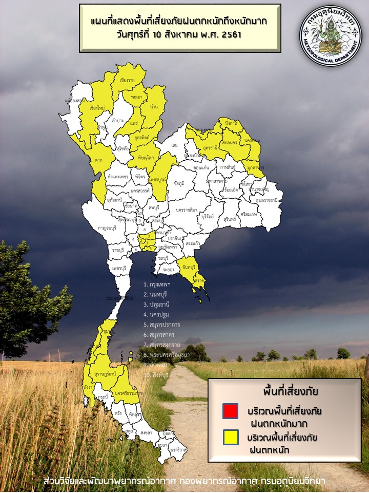 - ประเทศไทยยังคงมีฝนฟ้าคะนองหลายพื้นที่ กับมีฝนตกหนักบางแห่งบริเวณภาคเหนือ ภาคตะวันออกเฉียงเหนือ ภาคกลาง ภาคตะวันออก และภาคใต้ ขอให้ประชาชนระวังอันตรายจากฝนตกหนักและฝนที่ตกสะสม อาจทำให้เกิดน้ำท่วมฉับพลัน น้ำป่าไหลหลากไว้ด้วย สำหรับบริเวณทะเลอันดามันมีคลื่นสูง 2-3 เมตร อ่าวไทยตอนบนมีคลื่นสูงประมาณ 2 เมตร และบริเวณที่มีฝนฟ้าคะนองทะเลมีคลื่นสูงมากกว่า 3 เมตร ขอให้ชาวเรือเดินเรือด้วยความระมัดระวังและเรือเล็กควรงดออกจากฝั่งต่อไปอีก จนถึงวันที่ 16 ส.ค. 61
