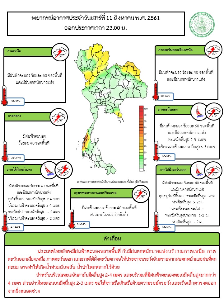 - ประเทศไทยยังคงมีฝนฟ้าคะนองหลายพื้นที่ กับมีฝนตกหนักบางแห่งบริเวณภาคเหนือ ภาคตะวันออกเฉียงเหนือ ภาคตะวันออก และภาคใต้ฝั่งตะวันตก ขอให้ประชาชนระวังอันตรายจากฝนตกหนักและฝนที่ตกสะสม อาจทำให้เกิดน้ำท่วมฉับพลัน น้ำป่าไหลหลากไว้ด้วย สำหรับบริเวณทะเลอันดามันมีคลื่นสูง 2-4 เมตร และบริเวณที่มีฝนฟ้าคะนองทะเลมีคลื่นสูงมากกว่า 4 เมตร ส่วนอ่าวไทยตอนบนมีคลื่นสูง 2-3 เมตร ขอให้ชาวเรือเดินเรือด้วยความระมัดระวังและเรือเล็กควรงดออกจากฝั่งตลอดช่วง