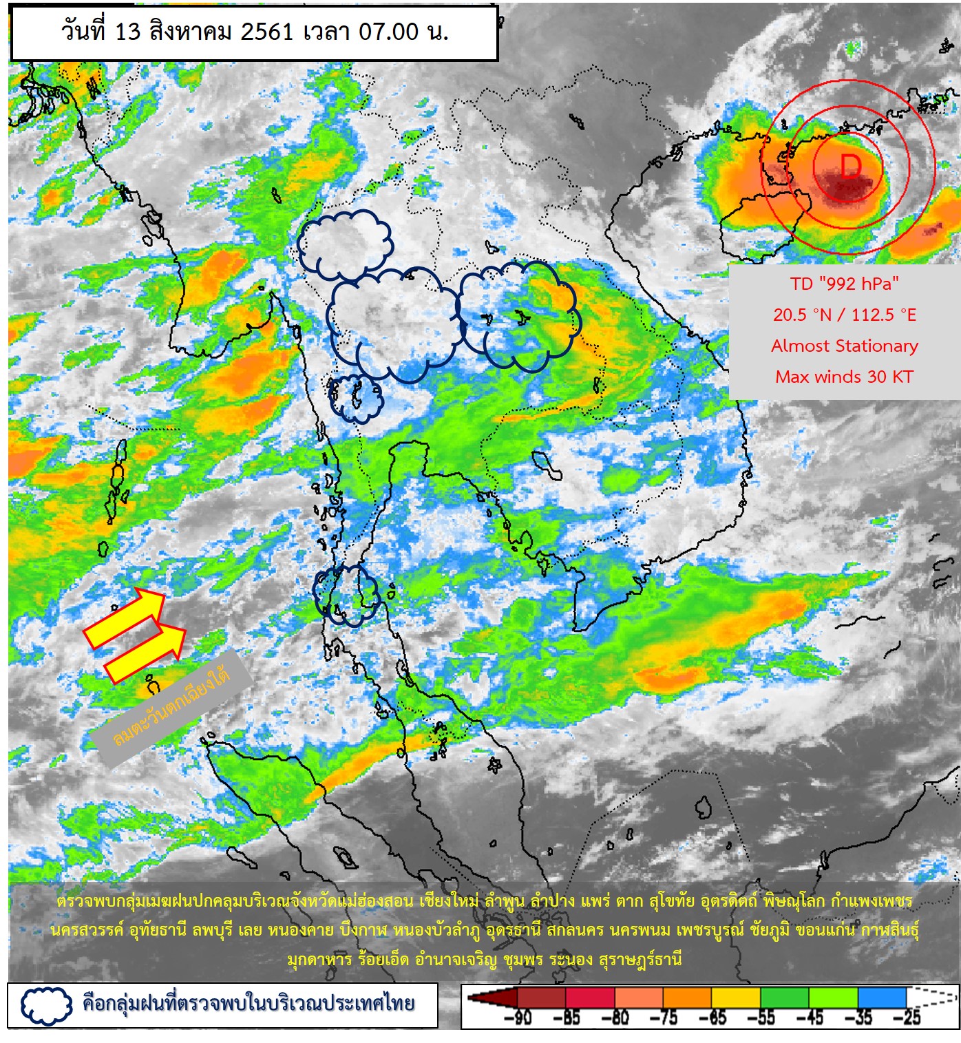 - ประเทศไทยมีฝนฟ้าคะนองหลายพื้นที่และมีฝนตกหนักบางแห่งบริเวณภาคเหนือ ภาคตะวันออกเฉียงเหนือ ภาคตะวันออก และภาคใต้ฝั่งตะวันตก ขอให้ประชาชนระวังอันตรายจากฝนตกหนักและฝนที่ตกสะสม อาจทำให้เกิดน้ำท่วมฉับพลัน น้ำป่าไหลหลากไว้ด้วย สำหรับทะเลอันดามันมีคลื่นสูง 2 – 4 เมตร และบริเวณที่มีฝนฟ้าคะนองทะเลมีคลื่นสูงมากกว่า 4 เมตร ส่วนอ่าวไทยตอนบนมีคลื่นสูง 2-3 เมตร ขอให้ชาวเรือเดินเรือด้วยความระมัดระวังและเรือเล็กควรงดออกจากฝั่งตลอดช่วง