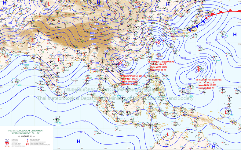 - ในช่วงวันที่ 16-18 ส.ค. 61 ประเทศไทยยังคงมีฝนฟ้าคะนองหลายพื้นที่ กับมีฝนตกหนักบางแห่งถึงหนักมากบางแห่งบริเวณภาคเหนือ ภาคตะวันออกเฉียงเหนือ ภาคกลาง ภาคตะวันออก และภาคใต้ฝั่งตะวันตก ส่วนในช่วงวันที่ 19-22 ส.ค. 61 ประเทศไทยจะมีปริมาณฝนลดลง แต่ยังมีฝนตกหนักบางแห่งบริเวณด้านตะวันตกของภาคเหนือ ภาคตะวันออก และภาคใต้ฝั่งตะวันตก สำหรับทะเลอันดามันมีคลื่นสูง 2-4 เมตร และอ่าวไทยตอนบนมีคลื่นสูง 2-3 เมตร ตลอดช่วง ข้อควรระวัง ขอให้ประชาชนบริเวณภาคเหนือ ภาคตะวันออกเฉียงเหนือ ภาคกลาง ภาคตะวันออก และภาคใต้ฝั่งตะวันตก ระวังผลกระทบจากฝนตกหนักและฝนที่ตกสะสมต่อเนื่อง ซึ่งอาจทำให้เกิดน้ำท่วมฉับพลัน น้ำป่าไหลหลาก น้ำล้นตลิ่ง และดินโคลนถล่มไว้ด้วย สำหรับชาวเรือบริเวณทะเลอันดามันและอ่าวไทยตอนบนควรเพิ่มความระมัดระวังในการเดินเรือและเรือเล็กควรงดออกจากฝั่งตลอดช่วง
