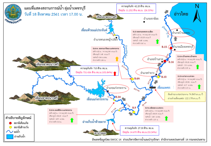 ดร.ทองเปลว กองจันทร์ อธิบดีกรมชลประทาน เปิดเผยถึงสถานการณ์น้ำที่เกิดจากฝนตกหนักในระยะนี้ว่า ที่เขื่อนแก่งกระจาน จ.เพชรบุรี สถานการณ์ปัจจุบัน มีปริมาณน้ำในอ่างฯ 751 ล้านลูกบาศก์เมตร (ลบ.ม.) หรือคิดเป็นร้อยละ 106 ของความจุอ่างฯ มีน้ำไหลลงอ่างฯวันละ 32 ล้าน ลบ.ม. มีน้ำล้นทางระบายน้ำล้น(Spillway) 0.91 เมตร