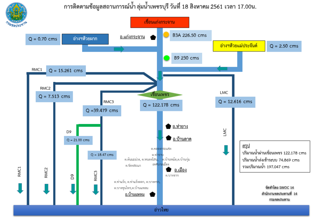ได้เร่งระบายน้ำผ่านช่องทางปกติ และกาลักน้ำที่ติดตั้งไว้ทั้งหมด 22 ชุด จากการติดตามระดับน้ำด้านท้ายเขื่อนแก่งกระจาน พบว่าบริเวณสถานีวัดน้ำ B3A อ.แก่งกระจาน มีน้ำไหลผ่านประมาณ 222 ลบ.ม./วินาที ระดับน้ำยังต่ำกว่าตลิ่ง 0.35 เมตร แนวโน้มเพิ่มขึ้น