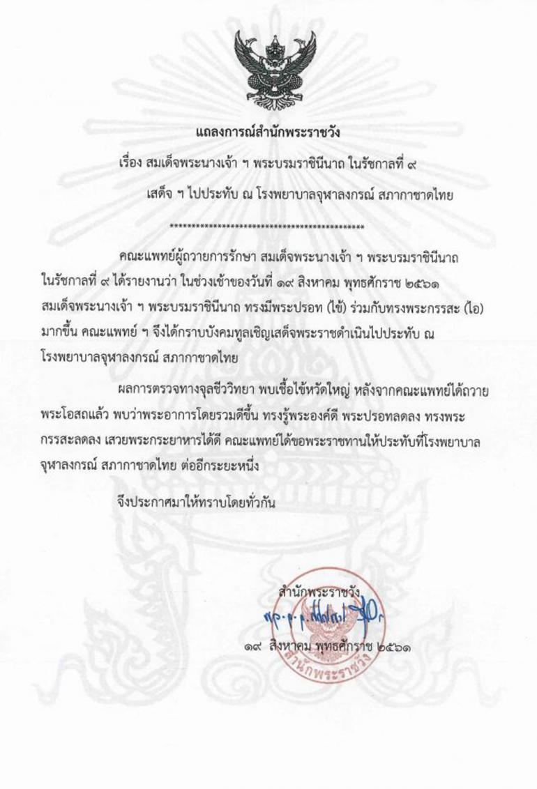 - คณะแพทย์ผู้ถวายการรักษาสมเด็จพระนางเจ้าฯ พระบรมราชินีนาถ ในรัชกาลที่ 9 ได้รายงานว่า ในช่วงเช้าของวันที่ 19 ส.ค. 61 สมเด็จพระนางเจ้าฯ พระบรมราชินีนาถทรงมีพระปรอท (ไข้) ร่วมกับทรงพระกรรสะ (ไอ) มากขึ้น คณะแพทย์ฯ จึงได้กราบบังคมทูลเชิญเสด็จพระราชดำเนินไปประทับ ณ รพ.จุฬาลงกรณ์ สภากาชาดไทย ผลการตรวจทางจุลชีววิทยาพบเชื้อไข้หวัดใหญ่ หลังจากคณะแพทย์ได้ถวายพระโอสถแล้วพบว่าพระอาการโดยรวมดีขึ้น ทรงรู้พระองค์ดี พระปรอทลดลง ทรงพระกรรสะลดลง เสวยพระกระยาหารได้ดี คณะแพทย์ได้ขอพระราชทานให้ประทับที่ รพ.จุฬาลงกรณ์ สภากาชาดไทยต่ออีกระยะหนึ่ง