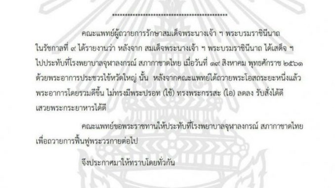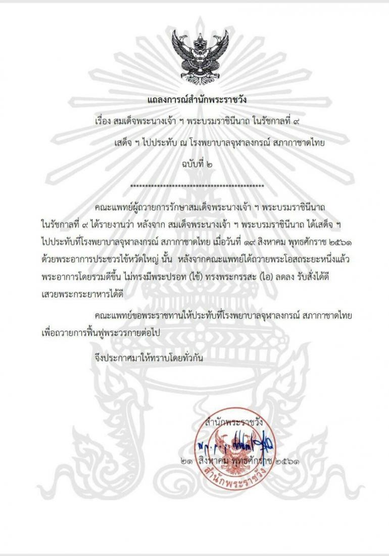 - แถลงการณ์สำนักพระราชวังเรื่อง สมเด็จพระนางเจ้าฯ พระบรมราชินีนาถ ในรัชกาลที่ 9 เสด็จพระราชดำเนินไปประทับ ณ โรงพยาบาลจุฬาลงกรณ์ สภากาชาดไทย ฉบับที่ 2 (21 กันยายน 2561) มีเนื้อความว่า คณะแพทย์ผู้ถวายการรักษาสมเด็จพระนางเจ้าฯ พระบรมราชินีนาถ ในรัชกาลที่ 9 ได้รายงานว่า หลังจาก สมเด็จพระนางเจ้าฯ พระบรมราชินีนาถ ได้เสด็จพระราชดำเนินไปประทับที่โรงพยาบาลจุฬาลงกรณ์ สภากาชาดไทย เมื่อวันที่ 19 สิงหาคม พุทธศักราช 2561 ด้วยพระอาการประชวรไข้หวัดใหญ่นั้น หลังจากคณะแพทย์ได้ถวายพระโอสถระยะหนึ่งแล้ว พระอาการโดยรวมดีขึ้น ไม่มีพระปรอท (ไข้) ทรงพระกรรสะ (ไอ) ลดลง รับสั่งได้ดี เสวยพระกระยาหารได้ดี คณะแพทย์ขอพระราชทานให้ประทับที่โรงพยาบาลจุฬาลงกรณ์ สภากาชาดไทย เพื่อถวายการฟื้นฟูพระวรกายต่อไป