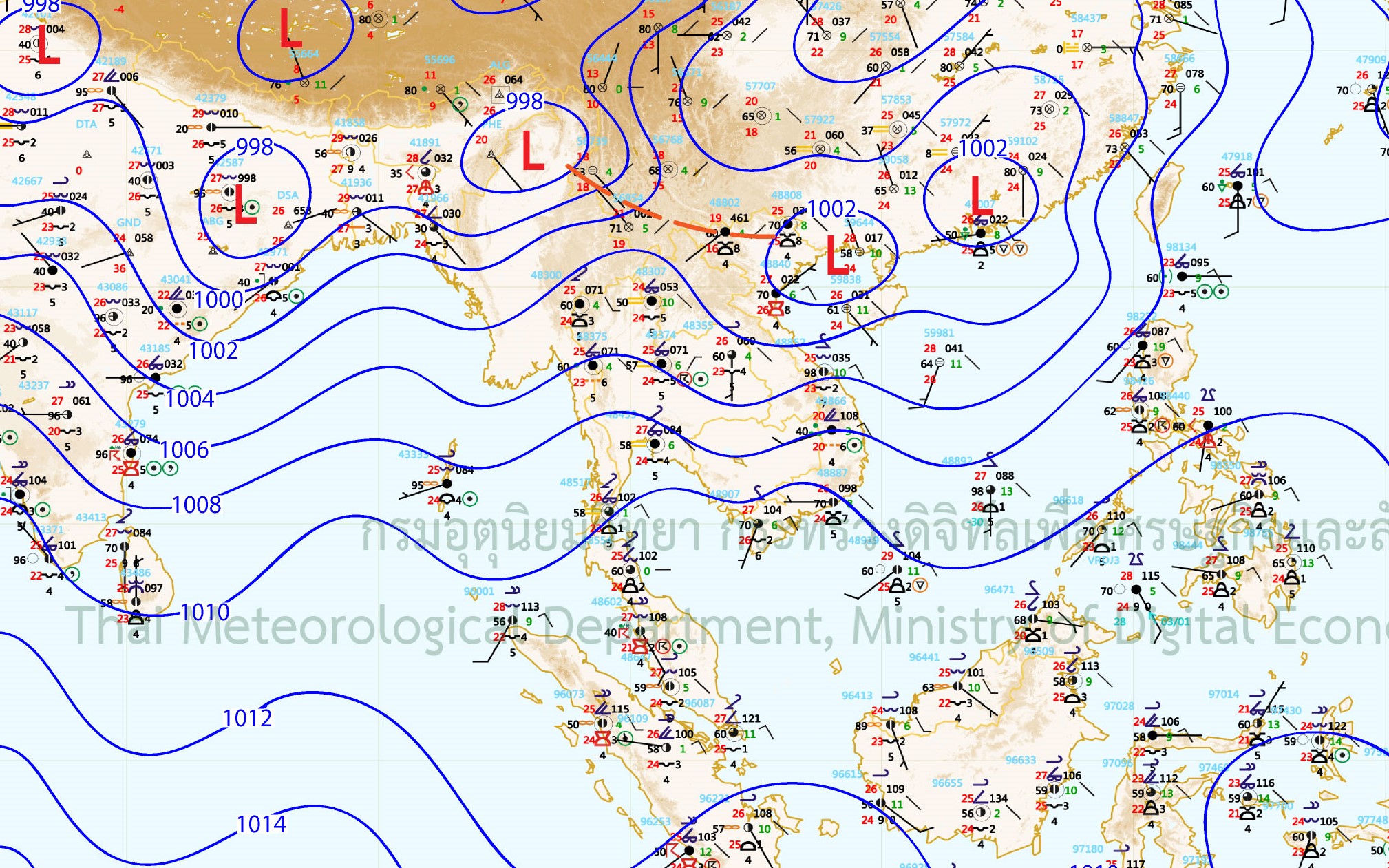 - ประเทศไทยมีฝนตกชุกหนาแน่น และมีฝนตกหนักบางแห่งบริเวณภาคเหนือ ภาคตะวันออกเฉียงเหนือ ภาคกลาง ภาคตะวันออก และภาคใต้ คลื่นลมบริเวณทะเลอันดามันมีคลื่นสูง 2 เมตร ส่วนอ่าวไทยตอนบนมีคลื่นสูง 1-2 เมตร ข้อควรระวัง ขอให้ประชาชนบริเวณภาคเหนือ ภาคตะวันออกเฉียงเหนือ ภาคกลาง ภาคตะวันออก และภาคใต้ ระวังผลกระทบจากฝนตกหนักและฝนที่ตกสะสมต่อเนื่อง ซึ่งอาจทำให้เกิดน้ำท่วมฉับพลัน น้ำป่าไหลหลาก น้ำล้นตลิ่ง และดินโคลนถล่มไว้ด้วย ชาวเรือบริเวณทะเลอันดามันควรเพิ่มความระมัดระวังในการเดินเรือ