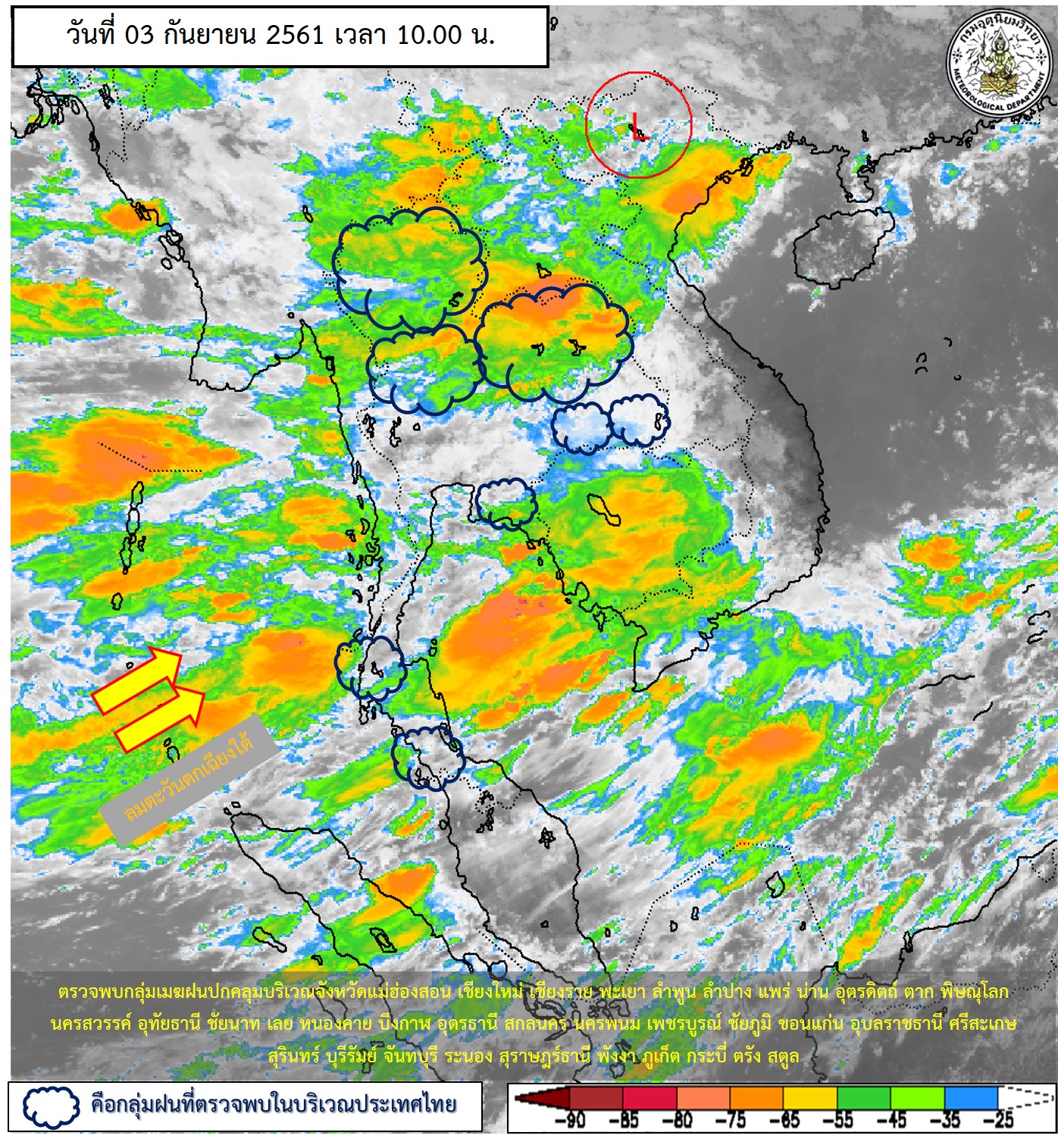 - ประเทศไทยมีฝนเพิ่มมากขึ้น และมีฝนตกหนักบางแห่งในบริเวณภาคเหนือ และภาคตะวันออก ขอให้ประชาชนในบริเวณดังกล่าวระวังอันตรายจากฝนตกหนักและฝนตกสะสม ที่ทำให้เกิดน้ำท่วมฉับพลัน และน้ำป่าไหลหลาก