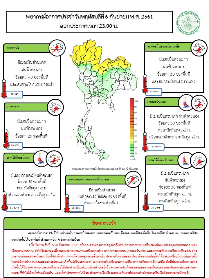 - ในช่วงวันที่ 7-10 ก.ย. 61 บริเวณความกดอากาศสูงกำลังปานกลางจากประเทศจีนจะแผ่ลงมาปกคลุมประเทศลาว และเวียดนามตอนบน ทำให้ร่องมรสุมเลื่อนลงมาพาดผ่านภาคเหนือตอนล่าง ภาคกลางตอนบน ภาคตะวันออก และภาคตะวันออกเฉียงเหนือตอนล่าง ประกอบกับมรสุมตะวันตกเฉียงใต้กำลังปานกลางพัดปกคลุมทะเลอันดามัน ประเทศไทย และอ่าวไทย ลักษณะเช่นนี้ทำให้ประเทศไทยมีฝนเพิ่มมากขึ้น โดยจะมีฝนฟ้าคะนองและลมกระโชกแรงเกิดขึ้นได้ในระยะแรก โดยเฉพาะในบริเวณภาคเหนือ ภาคตะวันออกเฉียงเหนือ กับมีฝนตกหนักบางแห่งเกิดขึ้นได้ในทุกภาคของประเทศไทย ขอให้ประชาชนในบริเวณดังกล่าวระวังอันตรายจากฝนฟ้าคะนองและลมกระโชกแรง และฝนตกหนักและฝนตกสะสม ที่ทำให้เกิดน้ำท่วมฉับพลัน และน้ำป่าไหลหลากไว้ด้วย ส่วนชาวเรือบริเวณทะเลอันดามันและอ่าวไทยควรเดินเรือด้วยความระมัดระวัง