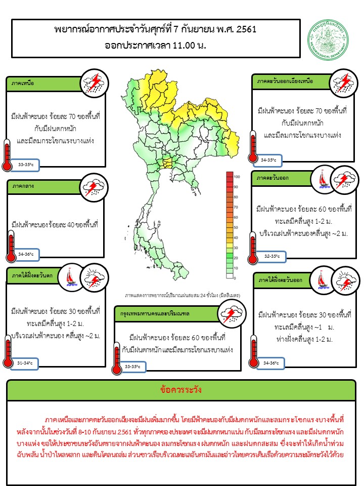 - ภาคเหนือ ภาคตะวันออกเฉียงเหนือ ภาคกลาง ภาคตะวันออก รวมทั้ง กทม.และปริมณฑล จะมีฝนเพิ่มมากขึ้น โดยมีฟ้าคะนองกับมีฝนตกหนักและลมกระโชกแรงบางพื้นที่ หลังจากนั้นในช่วงวันที่ 8-10 ก.ย. 61 ทั่วทุกภาคของประเทศ จะมีฝนตกหนาแน่น กับมีลมกระโชกแรง และมีฝนตกหนักบางแห่ง ขอให้ประชาชนระวังอันตรายจากฝนฟ้าคะนอง ลมกระโชกแรง ฝนตกหนัก และฝนตกสะสม ซึ่งจะทำให้เกิดน้ำท่วมฉับพลัน น้ำป่าไหลหลาก และดินโคลนถล่ม ส่วนชาวเรือบริเวณทะเลอันดามันและอ่าวไทยควรเดินเรือด้วยความระมัดระวังไว้ด้วย