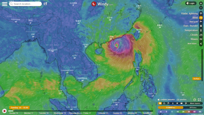 ภาพแสดงกระแสลมที่เกิดขึ้นจากพายุไต้ฝุ่นมังคุด กำลังเคลื่อนตัวเข้าสู่ประเทศจีนตอนใต้