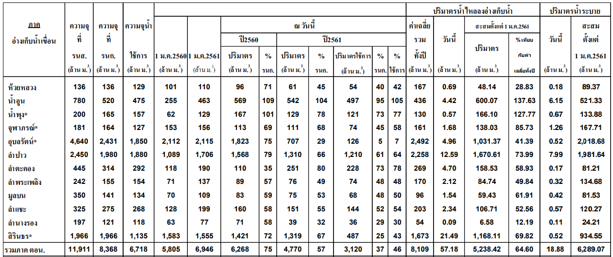 ตารางแสดงปริมาณน้ำและการระบายน้ำของเขื่อนในพื้นที่ภาคตะวันออกเฉียงเหนือ นายทวีศักดิ์ ธนเดโชพล รองอธิบดีกรมชลประทาน เปิดเผยว่า ได้เตรียมแผนการรับมือพายุไต้ฝุ่นมังคุดที่จะเข้าสู่ประเทศไทยระหว่างวันที่ 16-18 กันยายน 61 ซึ่งจะส่งผลให้ภาคเหนือและภาคตะวันออกเฉียงเหนือมีฝนเพิ่มมากขึ้นและมีฝนตกหนักในช่วงวันที่ 17-19 กันยายน 61 โดยกรมชลประทานได้เตรียมเครื่องจักรที่ใช้ในการระบายน้ำให้พร้อมใช้งานอยู่เสมอ และเร่งดำเนินการพร่องระบายน้ำจาก 5 เขื่อนหลักในภาคตะวันออกเฉียงเหนือเพื่อรองรับปริมาณน้ำฝนที่จะตกลงมาในช่วงเวลาดังกล่าว