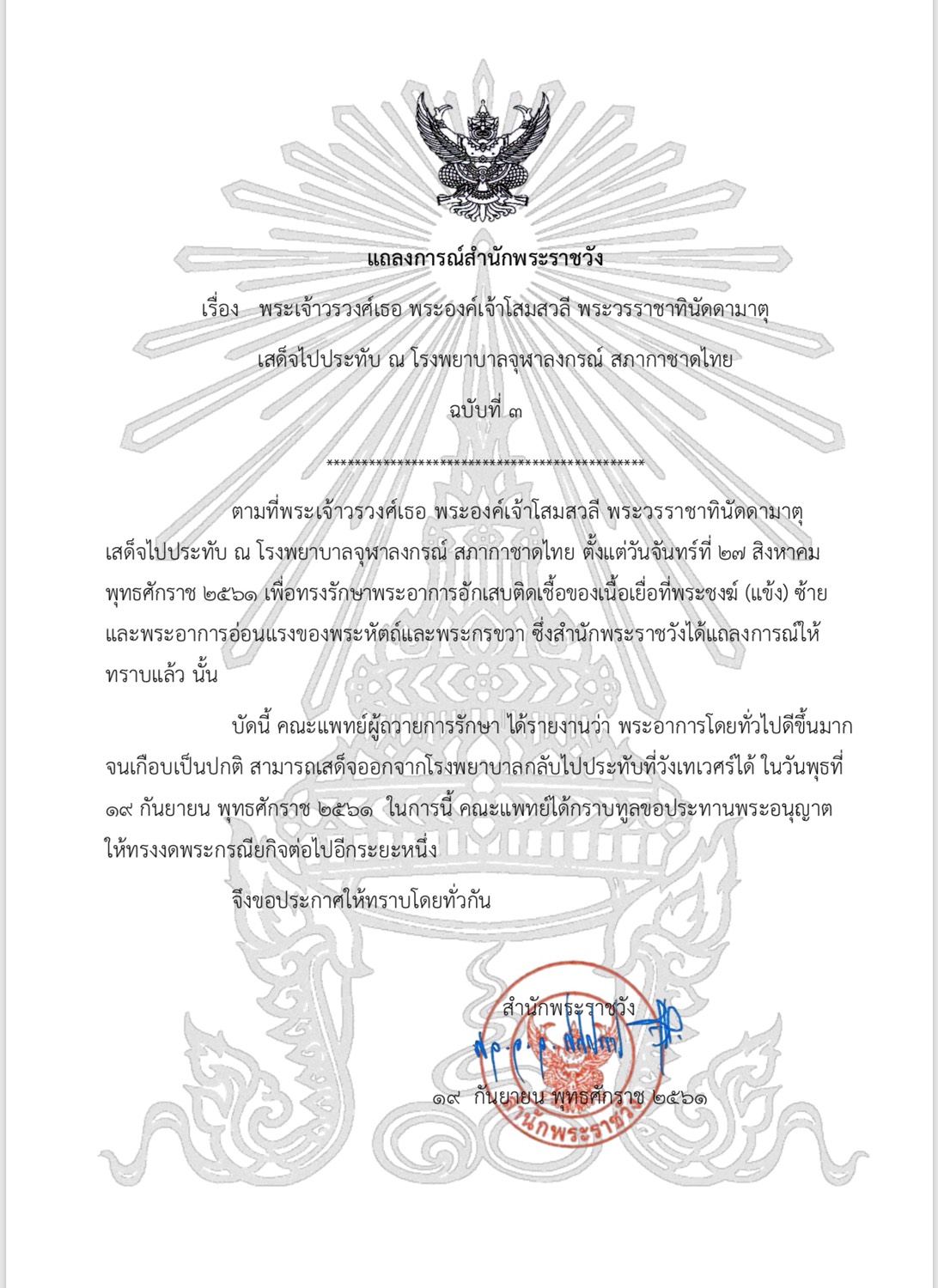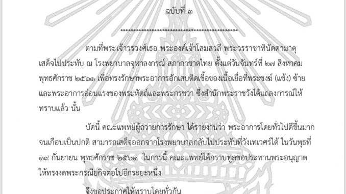 - สำนักพระราชวังออกแถลงการณ์ว่า ตามที่พระเจ้าวรวงศ์เธอ พระองค์เจ้าโสมสวลี พระวรราชาทินัดดามาตุ เสด็จไปประทับ ณ โรงพยาบาลจุฬาลงกรณ์ สภากาชาดไทย ตั้งแต่วันที่ 27 ส.ค. 61 เพื่อรักษาพระอาการอักเสบติดเชื้อของเนื้อเยื่อที่พระชงฆ์ (แข้ง) ซ้าย และอาการอ่อนแรงของพระหัตถ์และพระกรขวานั้น บัดนี้ คณะแพทย์ผู้ถวายการรักษาได้รายงานว่า พระอาการโดยทั่วไปดีขึ้นมากจนเกือบเป็นปกติ สามารถเสด็จออกจากโรงพยาบาลกลับไปประทับที่วังเทเวศร์ได้ ในวันที่ 19 ก.ย. 61 ในการนี้ คณะแพทย์ได้กราบทูลขอประทานพระอนุญาตให้ทรงงดพระกรณียกิจต่อไปอีกระยะหนึ่ง