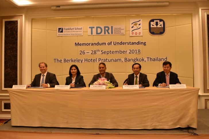 - ผู้อำนวยการฝ่ายสถาบันวิจัยเพื่อการพัฒนาประเทศไทย (นายนิพนธ์ฯ) เปิดเผยในงานแถลงข่าวความตกลงร่วมมือ “เชื่อมโยงงานวิจัย ภาคนโยบายและภาคธุรกิจ สู่การสร้างนักวิจัยเพื่อรับมือกับการเปลี่ยนเปลี่ยนแปลงสภาพภูมิอากาศ” ว่าสถาบันวิจัยเพื่อการพัฒนาประเทศไทยได้ร่วมกับแฟรงค์เฟิร์ตสคูล ลงนามข้อตกลงความร่วมมือระหว่าง สำนักงานกองทุนสนับสนุนการวิจัย (สกว.) และ ธนาคารเพื่อการเกษตรและสหกรณ์การเกษตร (ธ.ก.ส.) เพื่อสนับสนุน แผนงานทุนสนับสนุนการพัฒนา ศักยภาพด้านการเงินเพื่อรับมือกับการเปลี่ยนแปลงของภูมิอากาศ (ไอเอฟเอฟพี) โดยโครงการ “Adaptation Finance: Linking Research, Policy and Business-AFFP” รุ่นที่ 2 มีนักวิจัยร่วมทั้งสิ้น 36 คน มีคนไทย 2 คน ด้านนโยบาย 1 คน ด้านงานวิจัย 1 คน ซึ่งการที่ได้รับทุนจาก สกว. และ ธ.ก.ส. ทำให้มีคน ไทยเพิ่มเป็น 5 คน ซึ่งถือว่าเยอะที่สุดเท่าที่มีมาแล้ว โดยคนกลุ่มนี้เป็นกำลังสำคัญในการขับเคลื่อนประเทศ ในด้านรองรับการเปลี่ยนแปลงของสภาพอากาศต่อไป