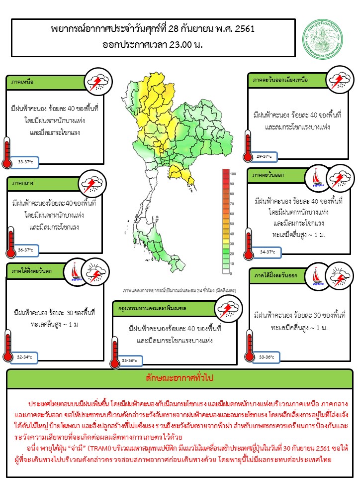 - บริเวณภาคเหนือ ภาคตะวันออกเฉียงเหนือ ภาคกลาง และภาคตะวันออกมีฝนฟ้าคะนองกับมีลมกระโชกแรง ขอให้ประชาชนบริเวณดังกล่าวระวังอันตรายจากฝนฟ้าคะนองและลมกระโชกแรง โดยหลีกเลี่ยงการอยู่ในที่โล่งแจ้ง ใต้ต้นไม้ใหญ่ ป้ายโฆษณา และสิ่งปลูกสร้างที่ไม่แข็งแรง รวมถึงระวังอันตรายจากฟ้าผ่า สำหรับเกษตรกรควรเตรียมการป้องกันและระวังความเสียหายที่จะเกิดต่อผลผลิตทางการเกษตรไว้ด้วย อนึ่ง พายุไต้ฝุ่น “จ่ามี” (TRAMI) บริเวณมหาสมุทรแปซิฟิก มีแนวโน้มเคลื่อนเข้าประเทศญี่ปุ่นในวันที่ 30 กันยายน 2561 ขอให้ผู้ที่จะเดินทางไปบริเวณดังกล่าวตรวจสอบสภาพอากาศก่อนเดินทางด้วย โดยพายุนี้ไม่มีผลกระทบต่อประเทศไทย
