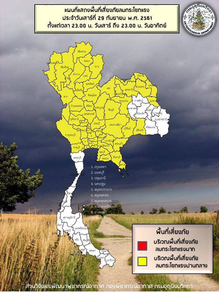 พยากรณ์อากาศ 24 ชั่วโมงข้างหน้า ภาคเหนือ ภาคตะวันออกเฉียงเหนือ ภาคกลาง และภาคตะวันออก มีฝนฟ้าคะนองกับมีลมกระโชกแรง ขอให้ประชาชนบริเวณดังกล่าวระวังอันตรายจากฝนฟ้าคะนองและลมกระโชกแรง โดยหลีกเลี่ยงการอยู่ในที่โล่งแจ้ง ใต้ต้นไม้ใหญ่ ป้ายโฆษณา และสิ่งปลูกสร้างที่ไม่แข็งแรง รวมถึงระวังอันตรายจากฟ้าผ่า สำหรับเกษตรกรควรเตรียมการป้องกันและระวังความเสียหายที่จะเกิดต่อผลผลิตทางการเกษตรไว้ด้วย สำหรับ กรุงเทพมหานครและปริมณฑล มีเมฆเป็นส่วนมาก กับมีฝนฟ้าคะนอง ร้อยละ 40 ของพื้นที่ และมีลมกระโชกแรงบางแห่ง อนึ่ง พายุไต้ฝุ่น “จ่ามี” (TRAMI) บริเวณมหาสมุทรแปซิฟิก มีแนวโน้มเคลื่อนเข้าประเทศญี่ปุ่นในวันที่ 30 กันยายน 2561 ขอให้ผู้ที่จะเดินทางไปบริเวณดังกล่าวตรวจสอบสภาพอากาศก่อนเดินทางด้วย โดยพายุนี้ไม่มีผลกระทบต่อประเทศไทย