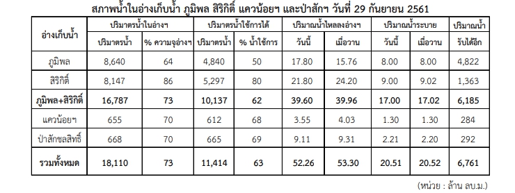 ปริมาณน้ำใช้การได้ในอ่างเก็บน้ำหลักของแม่น้ำเจ้าพระยา ได้แก่ เขื่อนภูมิพล เขื่อนสิริกิติ์ เขื่อนแควน้อยบำรุงแดน และเขื่อนป่าสักชลสิทธิ์ มีปริมาณทั้งสิ้น 11,414 ล้าน ลบ.ม. สูงกว่าวันเดียวกันของปี 2560 ถึง 976 ล้าน ลบ.ม. และในช่วงนี้จะพบว่ามีปริมาณน้ำไหลลงอ่างรวมประมาณ 52 ล้าน ลบ.ม. ต่อวัน ขณะที่ปริมาณน้ำระบายอยู่ที่ประมาณ 20 ล้าน ลบ.ม. ต่อวัน ทั้งนี้ สภาพน้ำท่าในลุ่มเจ้าพระยามีแนวโน้มลดลง อยู่ในเกณฑ์ปกติ ไม่มีน้ำล้นตลิ่งหรือน้ำท่วมในพื้นที่ลุ่มต่ำนอกคันกั้นน้ำ - สถานการณ์อุทกภัย จังหวัดนครนายก มีพื้นที่ประสบอุทกภัยจำนวน 2 อำเภอ ได้แก่ อ.องครักษ์ และ อ.บ้านนา พื้นที่ลุ่มต่ำได้รับผลกระทบประมาณ 1,040 ไร่ ระดับน้ำ ณ วันที่ 29 ก.ย. 61 มีแนวโน้มลดลง