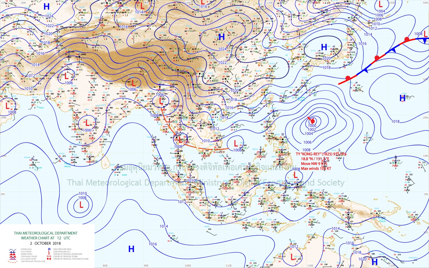- ภาคเหนือ ภาคกลาง ภาคตะวันออก และภาคใต้ตอนบน มีฝนฟ้าคะนอง ลมกระโชกแรง และมีฝนตกหนักบางแห่ง ส่วนภาคตะวันออกเฉียงเหนือจะมีฝนลดลง ประชาชนบริเวณดังกล่าวควรระวังอันตรายจากฝนฟ้าคะนอง ลมกระโชกแรง และมีฝนตกหนัก โดยหลีกเลี่ยงการอยู่ในที่โล่งแจ้ง ใต้ต้นไม้ใหญ่ ป้ายโฆษณา และสิ่งปลูกสร้างที่ไม่แข็งแรง รวมถึงระวังอันตรายจากฟ้าผ่า เกษตรกรควรเตรียมการป้องกันและระวังความเสียหายที่จะเกิดต่อผลผลิตทางการเกษตรไว้ด้วย ในช่วงวันที่ 3-7 ต.ค. 61 ความกดอากาศสูงกำลังปานกลางจากประเทศจีนอีกระรอกหนึ่งจะแผ่เสริมเข้ามาปกคลุมประเทศไทยตอนบน ทำให้ประเทศไทยตอนบนมีฝนลดลง อุณหภูมิจะลดลง 2-3 องศาเซลเซียส กับมีลมแรง ประกอบกับในช่วงวันที่ 4-6 ต.ค. 61 ร่องมรสุมเลื่อนมาพาดผ่านภาคใต้ ทำให้ภาคใต้มีฝนเพิ่มขึ้น และมีฝนตกหนักบางแห่ง