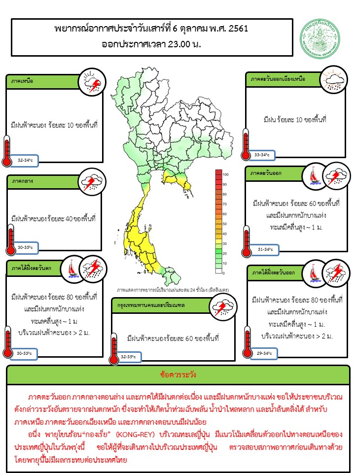 อนึ่ง พายุโซนร้อน“กองเร็ย” (KONG-REY) บริเวณทะเลญี่ปุ่น ได้อ่อนกำลังลงเป็นหย่อมความกดอากาศต่ำกำลังแรงแล้ว ขอให้ผู้ที่จะเดินทางไปบริเวณประเทศญี่ปุ่น ตรวจสอบสภาพอากาศก่อนเดินทางด้วย โดยพายุนี้ไม่มีผลกระทบต่อประเทศไทย - ลักษณะสำคัญทางอุตุนิยมวิทยา บริเวณความกดอากาศสูงกำลังอ่อนจากประเทศจีนแผ่ลงมาปกคลุมภาคเหนือ ภาคตะวันออกเฉียงเหนือ และทะเลจีนใต้ ทำให้มีลมตะวันออกพัดเข้ามาปกคลุมภาคตะวันออกเฉียงเหนือตอนล่าง ภาคกลาง ภาคตะวันออก และภาคใต้ ในขณะที่ร่องมรสุมยังคงพาดผ่านภาคใต้เข้าสู่หย่อมความกดอากาศต่ำบริเวณทะเลจีนใต้ตอนล่าง ลักษณะเช่นนี้ทำให้ภาคกลางตอนล่าง ภาคตะวันออก และภาคใต้ ยังคงมีฝนตกต่อเนื่อง และมีฝนตกหนักบางแห่ง