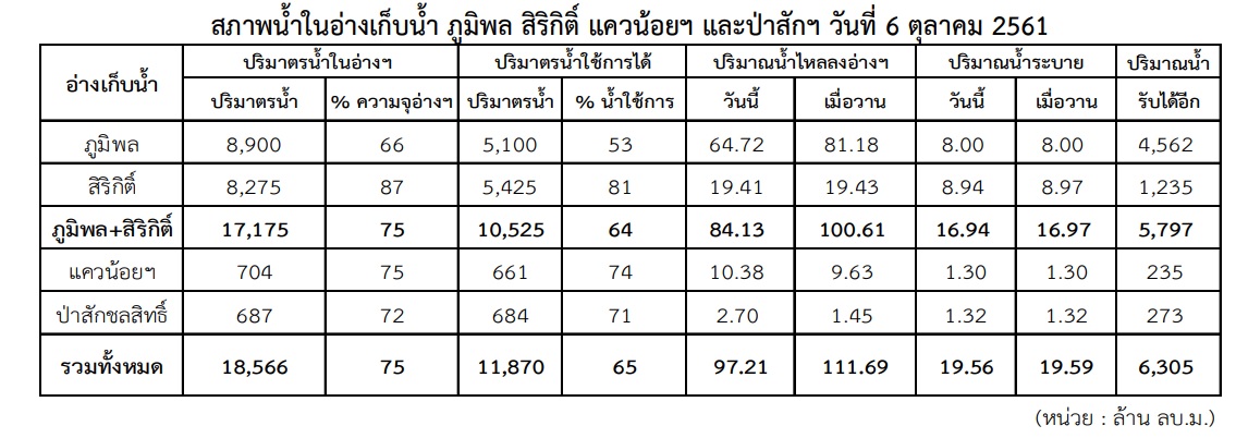 - ปริมาณน้ำใช้การได้ในอ่างเก็บน้ำหลักของแม่น้ำเจ้าพระยา ได้แก่ เขื่อนภูมิพล เขื่อนสิริกิติ์ เขื่อนแควน้อยบำรุงแดน และเขื่อนป่าสักชลสิทธิ์ มีปริมาณทั้งสิ้น 18,566 ล้าน ลบ.ม. และในช่วงนี้จะพบว่ามีปริมาณน้ำไหลลงอ่างรวมประมาณ 97.21 ล้าน ลบ.ม. ต่อวัน ขณะที่ปริมาณน้ำระบายอยู่ที่ประมาณ 19.59 ล้าน ลบ.ม. ต่อวัน
