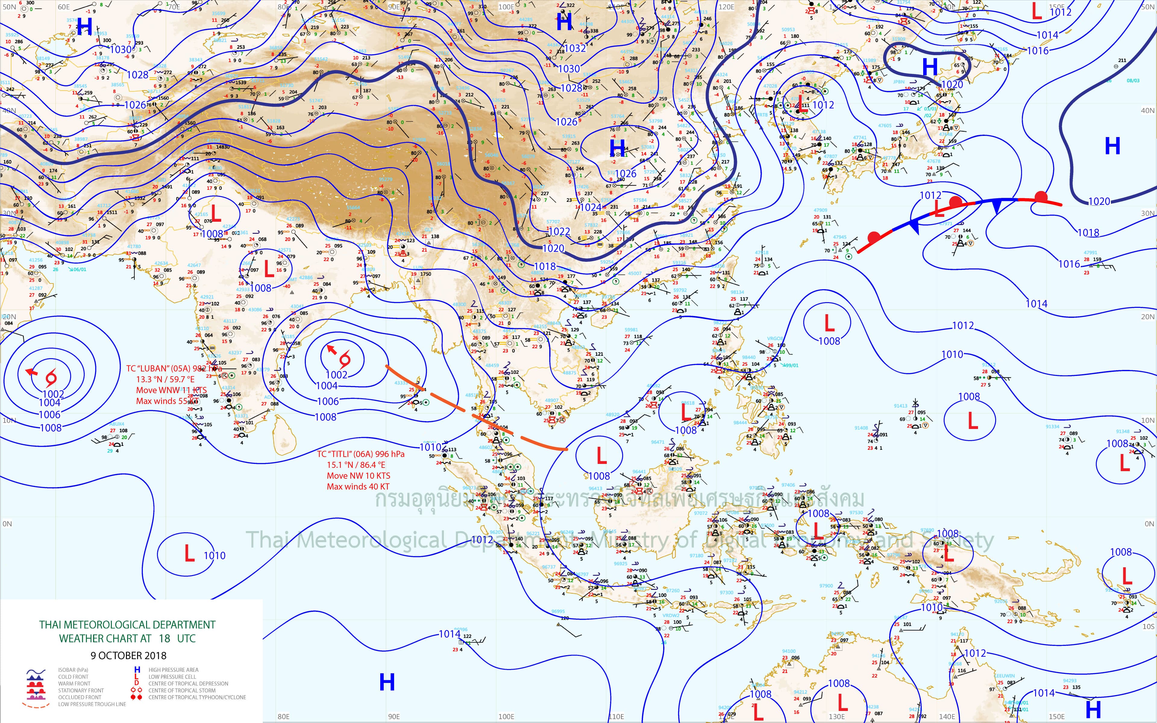 พยากรณ์อากาศ 24 ชั่วโมงข้างหน้า ภาคตะวันออก ภาคใต้ รวมทั้งกรุงเทพมหานครและปริมณฑล มีฝนตกหนักบางแห่ง ขอให้ประชาชนบริเวณดังกล่าวระวังอันตรายจากฝนตกหนัก ซึ่งจะทำให้เกิดน้ำท่วมฉับพลัน น้ำป่าไหลหลาก และน้ำล้นตลิ่งได้ อนึ่ง พายุไซโคลน “ติตลี” (TITLI) บริเวณอ่าวเบงกอล มีแนวโน้มเคลื่อนตัวเข้าสู่ชายฝั่งด้านตะวันออกของประเทศอินเดีย และประเทศบังคลาเทศ ในช่วงวันที่ 11-13 ตุลาคม 2561 ขอให้ผู้ที่เดินทางไปบริเวณดังกล่าวตรวจสอบสภาพอากาศก่อนออกเดินทางด้วย