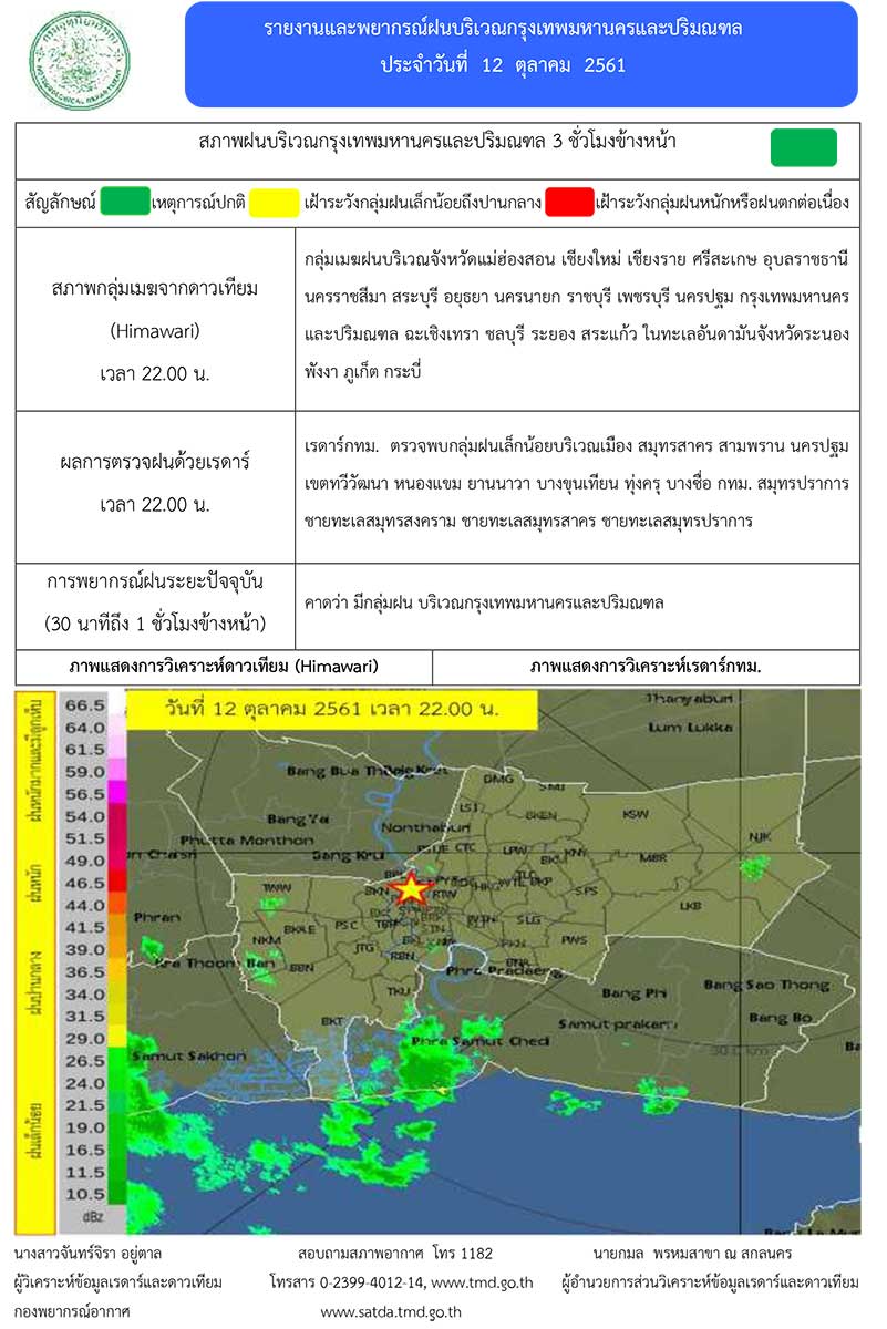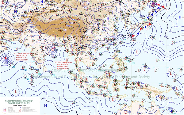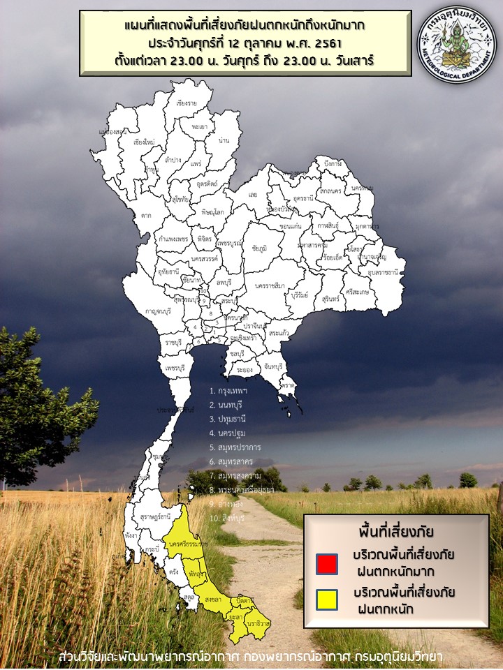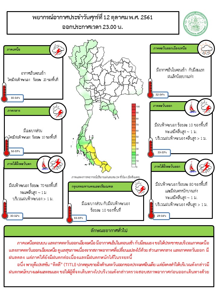 - ภาคเหนือตอนบน และภาคตะวันออกเฉียงเหนือ มีอากาศเย็นในตอนเช้า กับมีลมแรง ขอให้ประชาชนบริเวณภาคเหนือ และ ภาคตะวันออกเฉียงเหนือ ดูแลสุขภาพเนื่องจากสภาพอากาศที่เปลี่ยนแปลงไว้ด้วย ส่วนภาคกลาง และภาคตะวันออก มีฝนลดลง แต่ภาคใต้ยังมีฝนตกต่อเนื่องและมีฝนตกหนักได้ในระยะนี้ อนึ่ง พายุดีเปรสชัน “ติตลี” (TITLI) ปกคลุมชายฝั่งด้านตะวันออกของประเทศอินเดีย แต่ยังคงทำให้บริเวณดังกล่าวมีฝนตกหนักบางแห่งและลมแรง