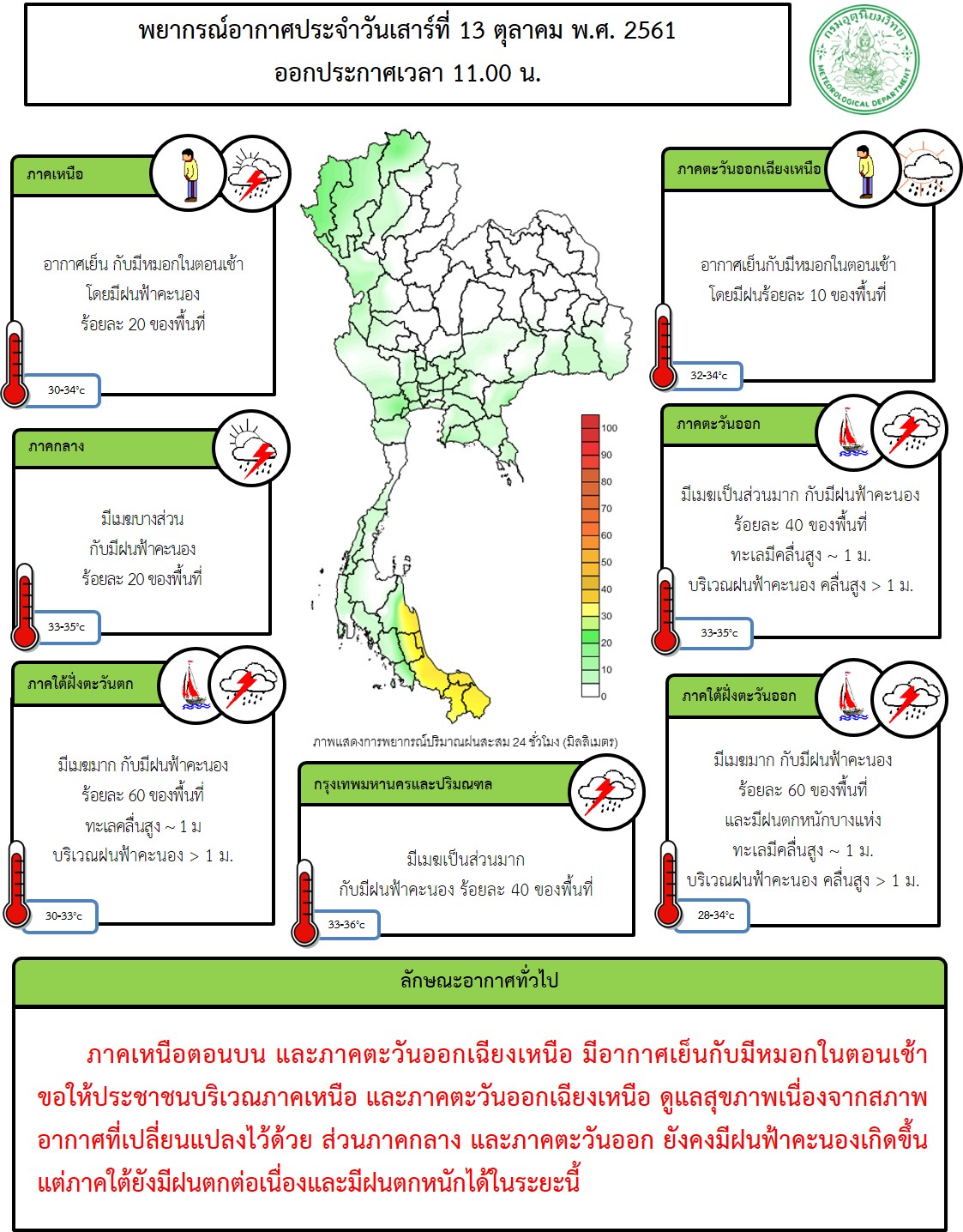 - กรมอุตุนิยมวิทยา พยากรณ์อากาศ 24 ชั่วโมงข้างหน้า ภาคเหนือตอนบน และภาคตะวันออกเฉียงเหนือตอนบน มีอากาศเย็นกับมีหมอกในตอนเช้า ขอให้ประชาชนบริเวณภาคเหนือ และภาคตะวันออกเฉียงเหนือ ดูแลสุขภาพเนื่องจากสภาพอากาศที่เปลี่ยนแปลงไว้ด้วย ส่วนภาคกลาง และภาคตะวันออก ยังคงมีฝนฟ้าคะนองเกิดขึ้น สำหรับภาคใต้ยังมีฝนตกต่อเนื่องและมีฝนตกหนักได้ในระยะนี้
