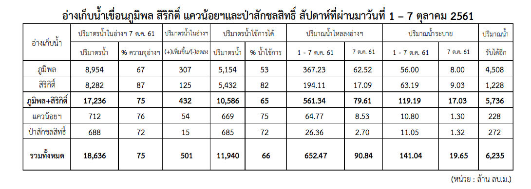 - ปริมาณน้ำใช้การได้ในอ่างเก็บน้ำหลักของแม่น้ำเจ้าพระยา ได้แก่ เขื่อนภูมิพล เขื่อนสิริกิติ์ เขื่อนแควน้อยบำรุงแดน และเขื่อนป่าสักชลสิทธิ์ มีปริมาณทั้งสิ้น 18,636 ล้าน ลบ.ม. และในช่วงนี้จะพบว่ามีปริมาณน้ำไหลลงอ่างรวมประมาณ 90.84 ล้าน ลบ.ม. ต่อวัน ขณะที่ปริมาณน้ำระบายอยู่ที่ประมาณ 19.65 ล้าน ลบ.ม. ต่อวัน