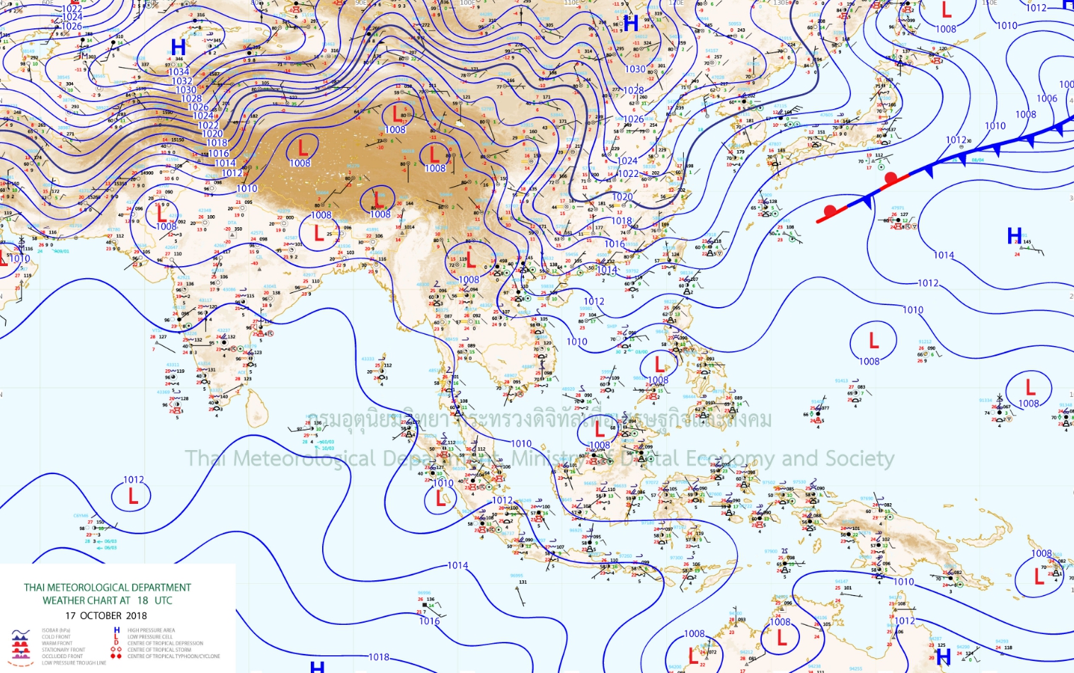 - กรุงเทพและปริมณฑล มีฝนฟ้าคะนองร้อยละ 30-40 ของพื้นที่ ลมตะวันตก ความเร็ว 15-30 กม./ชม. ภาคเหนือ มีฝนฟ้าคะนองร้อยละ 30-40 ของพื้นที่ กับมีฝนตกหนักบางแห่ง ภาคตะวันออกเฉียงเหนือและภาคตะวันออก ยังคงมีฝนฟ้าคะนองต่อเนื่อง ภาคใต้ มีฝนตกหนักบางพื้นที่ ทะเลมีคลื่นสูงประมาณ 1 เมตร และบริเวณที่มีฝนฟ้าคะนองคลื่นจะสูงมากกว่า 1 เมตร ข้อควรระวัง ในช่วงวันที่ 19-23 ต.ค. 61 ขอให้ประชาชนบริเวณภาคตะวันออกและภาคใต้ ระวังอันตรายจากฝนตกหนักและฝนตกสะสมไว้ด้วย