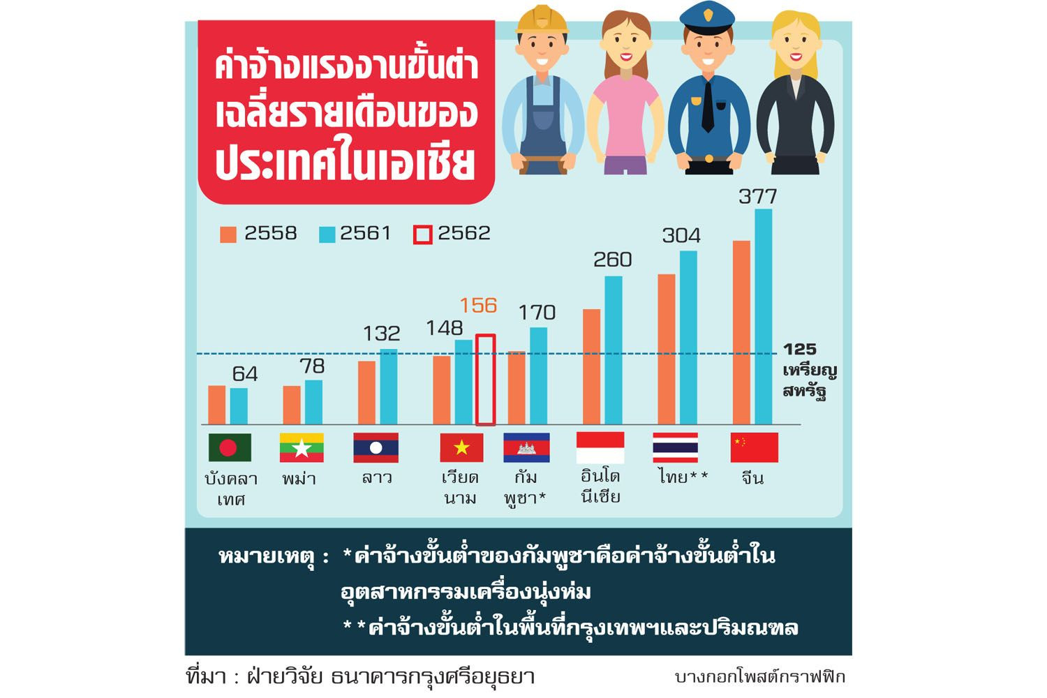 ที่ประชุมคณะกรรมการกำหนดค่าจ้างแรงงานของเวียดนาม (Vietnam’s National Wage Council) เห็นชอบการปรับขึ้นอัตราค่าจ้างแรงงานขั้นต่ำรายเดือนประจำปี 2562 ร้อยละ 5.3 หรือเฉลี่ยราว 1.75 แสนด่อง/เดือน ทำให้ค่าจ้างแรงงานอัตราใหม่อยู่ในช่วง 2.92-4.18 ล้านด่อง/เดือน หรือราว 125-180 ดอลลาร์สหรัฐ/เดือน ซึ่งต่ำกว่าอัตราค่าจ้างขั้นต่ำเฉลี่ยของหลายประเทศในเอเชีย สะท้อนว่าเวียดนามยังมีความได้เปรียบ โดยเปรียบเทียบด้านต้นทุนแรงงานที่จะเอื้อให้ประเทศสามารถดึงดูดการลงทุนจากต่างประเทศได้ต่อไป
