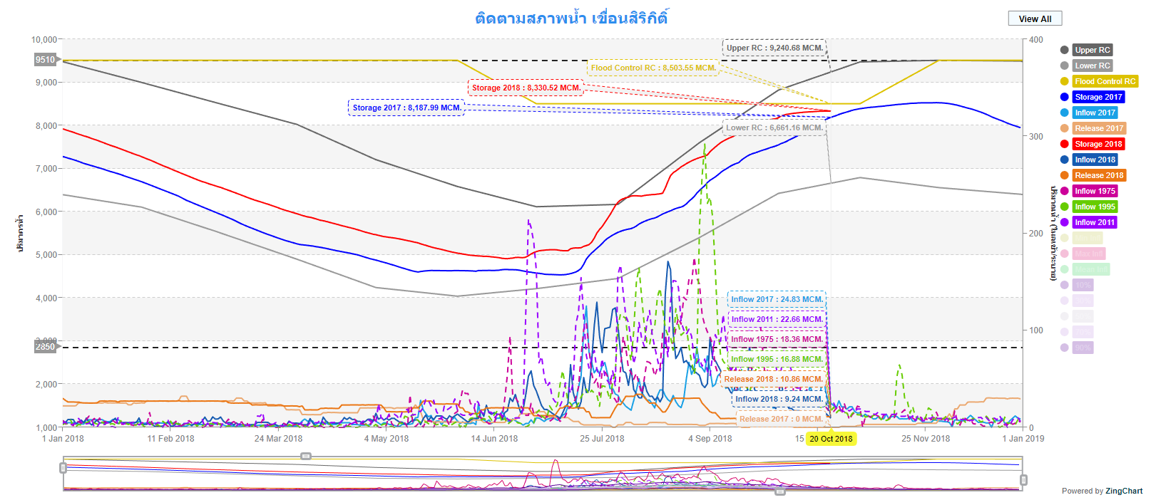 สภาพน้ำในอ่างเก็บน้ำขนาดใหญ่ที่สำคัญต่อลุ่มน้ำเจ้าพระยา ได้แก่ เขื่อนภูมิพล เขื่อนสิริกิติ์ เขื่อนแควน้อยบำรุงแดน และเขื่อนป่าสักชลสิทธิ์ ในวันนี้ พบว่าเขื่อนสิริกิติ์มีปริมาณน้ำเพิ่มสูงขึ้นจากช่วงต้นเดือนตุลาคมกว่าร้อยละ 10 โดยปัจจุบันมีปริมาตรน้ำในเขื่อนสูงถึงร้อยละ 88 หรือ 8,333 ล้าน ลบ.ม. ซึ่งระดับน้ำดังกล่าวอยู่ต่ำกว่าระดับสำหรับควบคุมการปล่อยน้ำในช่วงฤดูน้ำหลาก (Flood Control Rule Curve: FCRC) เพียง 170 ล้าน ลบ.ม. เท่านั้น หากมีปริมาณน้ำเกินระดับ FCRC จะต้องเร่งระบายน้ำผ่านทางระบายน้ำล้นเพื่อเตรียมรับปริมาณน้ำหลากที่อาจเกิดขึ้นต่อไป