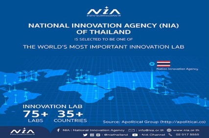 - ดร. พันธุ์อาจ ชัยรัตน์ ผู้อำนวยการสำนักงานนวัตกรรมแห่งชาติ (องค์การมหาชน) หรือ NIA เปิดเผยว่า NIA ได้ถูกจัดอันดับให้เป็นห้องปฏิบัติการนวัตกรรมของภาครัฐที่สำคัญของโลก โดยการรวบรวมของ Apolitical Group ซึ่งเป็นองค์กรอิสระสากลในการพัฒนาเครือข่ายและบริการภาครัฐให้พร้อมรับความเปลี่ยนแปลงและตอบโจทย์ความท้าทายของสังคม NIA เป็นหนึ่งในศูนย์รวมความรู้และการให้คำปรึกษาสำหรับประชาชน ผู้ประกอบการ หน่วยงานรัฐ ที่ต้องการความรู้ทางด้านนวัตกรรมเพื่อใช้ขับเคลื่อนพัฒนาประเทศ โดยการเปิดพื้นที่และโอกาสให้สตาร์ทอัพด้านการพัฒนาอุตสาหกรรมเทคโนโลยีภาครัฐเข้ามาช่วยภาครัฐในการพัฒนาบริการสาธารณะให้ดีขึ้น ซึ่งในภูมิภาคเอเชียมีทั้งสิ้น 6 ประเทศ ได้แก่ ประเทศไทย ไต้หวัน สิงคโปร์ อินโดนีเซีย ศรีลังกา และจอร์เจีย จึงนับว่าเป็นอีกหนึ่งความภาคภูมิใจที่ได้รับการยอมรับด้านนวัตกรรมระดับสากล