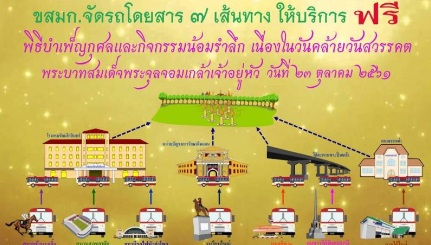 - นายประยูร ช่วยแก้ว รองผู้อำนวยการฝ่ายการเดินรถองค์การ และรักษาการผู้อำนวยการองค์การขนส่งมวลชนกรุงเทพ (ขสมก.) เปิดเผยว่า ในวันที่ 23 ต.ค. 61 ขสมก. จะจัดรถเฉพาะกิจให้บริการฟรี ได้แก่ 1) วงเวียนใหญ่-สนามหลวง 2) หมอชิต 2-สนามหลวง 3) อนุสาวรีย์ชัยสมรภูมิ-สนามหลวง 4) หัวลำโพง-สนามหลวง 5) สนามศุภชลาศัย-สนามหลวง และ 6) สายใต้ใหม่-สนามหลวง รวมทั้งจัดรถชัตเติ้ลบัสให้บริการฟรี คือ สนามม้านางเลิ้ง-สนามหลวง โดยให้บริการตั้งแต่เวลา 12.00-21.00 น. เพื่ออำนวยความสะดวกให้ประชาชนเข้าร่วมพิธีบำเพ็ญกุศลและกิจกรรมน้อมรำลึก เนื่องในวันคล้ายวันสวรรคต พระบาทสมเด็จพระจุลจอมเกล้าเจ้าอยู่หัว