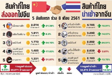 - นายจิตติ ตั้งสิทธิ์ภักดี ประธานหอการค้าไทย-จีน เปิดเผยว่า หอการค้าไทย-จีน ได้เตรียมรวบรวมข้อมูลผลกระทบสงครามการค้าจีน-สหรัฐ ที่จะส่งผลกระทบกับไทย เพื่อแนะนำผู้ประกอบการไทยให้ปรับตัวและสามารถแข่งขันได้ จากปัญหาดังกล่าวมีผลกระทบทำให้เศรษฐกิจจีนชะลอตัวลง และส่งผลกระทบต่อกำลังซื้อที่ทำให้การส่งออกไทยไปยังจีนลดลง โดยเฉพาะยางพาราที่เป็นสินค้าเกษตรของไทย ขณะที่อัตราแลกเปลี่ยนหรือค่าเงินบาทของไทยปรับตัวแข็งค่าขึ้น นอกจากนี้ยังมีความเป็นห่วงสถานการณ์นักท่องเที่ยวจีนลดลงด้วย แต่คาดว่าไตรมาส 4 สถานการณ์จะกลับเข้าสู่ภาวะปกติ น่าจะมีนักท่องเที่ยวจีนมาเที่ยวไทย 10 ล้านคน ตามเป้าหมาย
