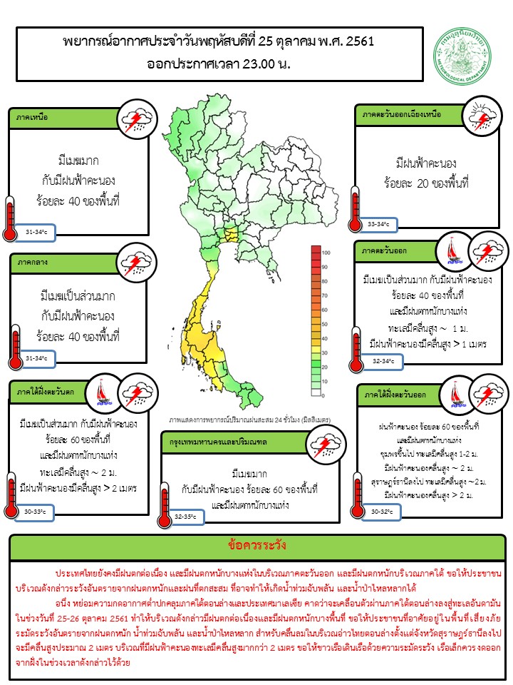 - ในช่วงวันที่ 25 – 26 ต.ค. ภาคกลางตอนล่าง ภาคตะวันออก และภาคใต้ มีฝนตกต่อเนื่อง และมีฝนตกหนักถึงหนักมากบางแห่งในภาคใต้ สำหรับบริเวณอ่าวไทยตอนบนทะเลมีคลื่นสูง 2-3 เมตร และบริเวณที่มีฝนฟ้าคะนองคลื่นสูงมากกว่า 3 เมตร ส่วนในช่วงวันที่ 27 – 31 ต.ค. ประเทศไทยตอนบนจะมีฝนลดลง โดยในภาคเหนือละภาคตะวันออกเฉียงเหนือ จะมีอากาศเย็นในตอนเช้า และอุณหภูมิจะลดลงเล็กน้อย สำหรับภาคใต้ยังคงมีฝนตกต่อเนื่องและมีฝนตกหนักบางแห่ง บริเวณอ่าวไทยและทะเลอันดามันมีคลื่นสูงประมาณ 2 เมตร