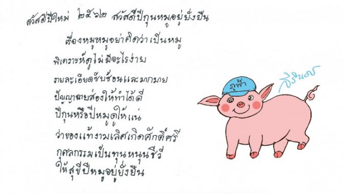 - สมเด็จพระเทพรัตนราชสุดาฯ สยามบรมราชกุมารี พระราชทาน ส.ค.ส.แก่ปวงชนชาวไทย เนื่องในโอกาสขึ้นปีใหม่ พ.ศ.2562 (ปีกุน) และในโอกาสนี้ ร้านภูฟ้าได้รับพระมหากรุณาธิคุณให้อัญเชิญภาพฝีพระหัตถ์พระราชทานในปีนี้คือ ภาพ “ปีกุนหมูอยู่ยั่งยืน” เป็นรูปหมูอ้วนสีชมพูหน้าตา รื่นเริง มาปักบนกระเป๋าเสื้อโปโลทั้ง 6 สี และเสื้อทีเชิ้ต 4 สี ที่จะออกจำหน่ายเป็นของขวัญปีใหม่ นอกจากนั้นยังมีพรปีใหม่พระราชทานให้แก่ปวงชนชาวไทยให้ควรใช้ ปัญญาในการพิเคราะห์สิ่งต่างๆ ที่จะเกิดขึ้นรอบๆ ตัวเรา ที่มีรายละเอียดซับซ้อนมากมาย ทุกสิ่งทุกอย่างที่เกิดขึ้นนั้น ให้ตระหนักว่าไม่ใช่เรื่องหมูๆ หรือเรื่องง่ายๆ อย่างที่คิดกัน อย่างไรก็ตามถ้าทุกคนทำแต่ความดีอยู่แล้ว ปีหมูจะเป็นปีที่มีความสุขอย่างยั่งยืนแน่นอน