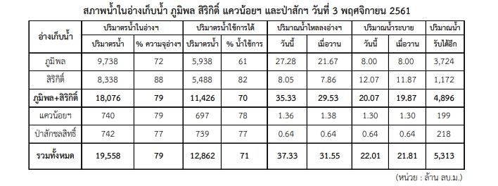 ปริมาณน้ำใช้การได้ในอ่างเก็บน้ำหลักของแม่น้ำเจ้าพระยา ได้แก่ เขื่อนภูมิพล เขื่อนสิริกิติ์ เขื่อนแควน้อยบำรุงแดน และเขื่อนป่าสักชลสิทธิ์ มีปริมาณทั้งสิ้น 12,862 ล้าน ลบ.ม. น้อยกว่าวันเดียวกันของปี 2560 จำนวน 1,379 ล้าน ลบ.ม. และในช่วงนี้จะพบว่ามีปริมาณน้ำไหลลงอ่างรวมประมาณ 37 ล้าน ลบ.ม. ต่อวัน ขณะที่ปริมาณน้ำระบายอยู่ที่ประมาณ 22 ล้าน ลบ.ม. ต่อวัน ทั้งนี้ สถานการณ์น้ำในแม่น้ำต่าง ๆ ทั่วประเทศอยู่ในสภาวะปกติ ไม่มีน้ำล้นตลิ่ง - สถานการณ์อากาศ