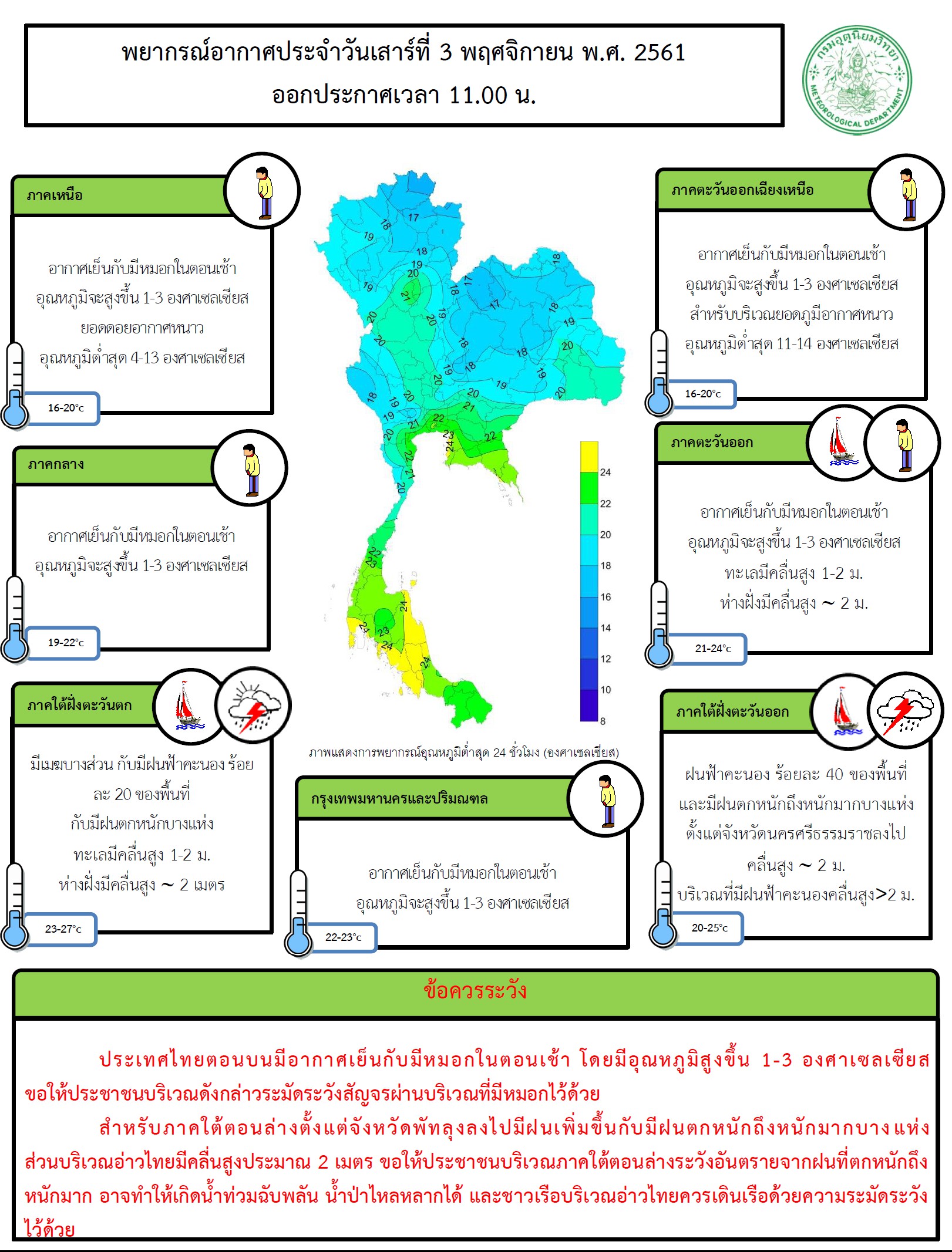 พยากรณ์อากาศ 24 ชั่วโมงข้างหน้า ประเทศไทยตอนบนมีอากาศเย็นกับมีหมอกในตอนเช้า โดยมีอุณหภูมิสูงขึ้น 1-3 องศาเซลเซียส ขอให้ประชาชนบริเวณดังกล่าวระมัดระวังสัญจรผ่านบริเวณที่มีหมอกไว้ด้วย สำหรับภาคใต้มีฝนเพิ่มขึ้นกับมีฝนตกหนักบางแห่ง ส่วนบริเวณอ่าวไทยมีคลื่นสูงประมาณ 2 เมตร ขอให้ประชาชนบริเวณภาคใต้ตอนล่างระวังอันตรายจากฝนที่ตกหนัก อาจทำให้เกิดน้ำท่วมฉับพลัน น้ำป่าไหลหลากได้ และชาวเรือบริเวณอ่าวไทยควรเดินเรือด้วยความระมัดระวัง สำหรับ กรุงเทพมหานครและปริมณฑล อากาศเย็นกับมีหมอกในตอนเช้า อุณหภูมิจะสูงขึ้น 1-3 องศาเซลเซียส อุณหภูมิต่ำสุด 22-23 องศาเซลเซียส อุณหภูมิสูงสุด 32-35 องศาเซลเซียส ลมตะวันออกเฉียงเหนือ ความเร็ว 10-30 กม./ชม.