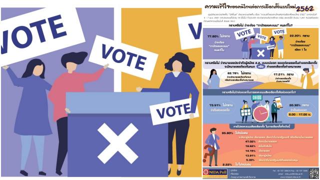 - ศูนย์สำรวจความคิดเห็น “นิด้าโพล” สถาบันบัณฑิตพัฒนบริหารศาสตร์ (นิด้า) เปิดเผยผลสำรวจความคิดเห็นของประชาชน อายุ 18 ปี ขึ้นไป จำนวน 1,261 หน่วยตัวอย่าง เรื่อง “ความเข้าใจของคนไทยต่อการเลือกตั้งแบบใหม่ 2562” ตามรัฐธรรมนูญ พ.ศ. 2560 โดยเมื่อถามถึงการไปลงคะแนนเสียงเลือกตั้งของประชาชนในการเลือกตั้งวันที่ 24 ก.พ. 62 พบว่า ประชาชนส่วนใหญ่ ร้อยละ 95.80 ระบุว่า ไปแน่นอน รองลงมา ร้อยละ 2.22 ระบุว่า ไม่ไปแน่นอน และร้อยละ 1.98 ไม่ระบุ/ไม่แน่ใจ ส่วนเมื่อถามถึงการรับทราบของประชาชนเกี่ยวกับการ “กาบัตรลงคะแนน” คนละกี่ใบ พบว่าประชาชนส่วนใหญ่ยังไม่เข้าใจระบบแบบใหม่ โดยร้อยละ 77.80 ระบุว่า ไม่ทราบว่าจะต้อง “กาบัตรลงคะแนน” คนละกี่ใบ และร้อยละ 22.20 ระบุว่า ทราบว่าจะต้อง “กาบัตรลงคะแนน” เพียง 1 ใบ