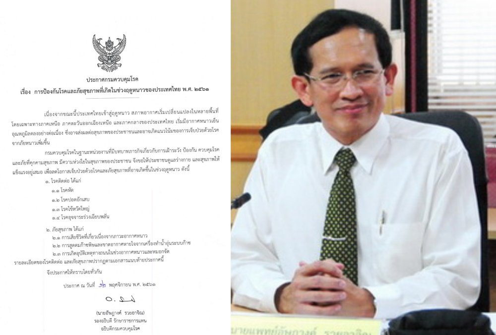 - รองอธิบดีกรมควบคุมโรค (นพ.อัษฎางค์ รวยอาจิณ) กล่าวว่า ขณะนี้ประเทศไทยเข้าสู่ช่วงฤดูหนาวแล้ว อากาศที่หนาวเย็นทำให้เชื้อโรคบางชนิดอยู่ในสิ่งแวดล้อมได้นานขึ้น แพร่กระจายง่ายและเร็วกว่าฤดูอื่นจึงได้ออกประกาศให้ระมัดระวัง 4 โรค 3 ภัยสุขภาพช่วงฤดูหนาว โดยแบ่งออกเป็น 2 กลุ่ม คือ 1) กลุ่มโรคติดต่อ ได้แก่ โรคหัด โรคปอดอักเสบหรือโรคปอดบวม โรคไข้หวัดใหญ่ และโรคอุจจาระร่วงเฉียบพลัน และ 2) กลุ่มภัยสุขภาพ ได้แก่ การเสียชีวิตที่เกี่ยวเนื่องจากภาวะอากาศหนาว การสูดดมก๊าซพิษและขาดอากาศหายใจจากเครื่องทำน้ำอุ่นระบบแก๊ส และการเกิดอุบัติเหตุทางถนนในช่วงอากาศหนาวและหมอกจัด
