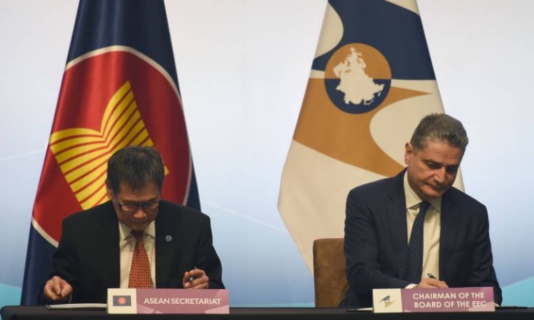 - นายลิ้ม จ็อก ฮอย เลขาธิการสมาคมประชาชาติแห่งเอเชียตะวันออกเฉียงใต้ (อาเซียน) และนายตีกราน ซาร์กเซียน ประธานฝ่ายบริหารของสหภาพเศรษฐกิจยูเรเชีย (อีเออียู) ลงนามร่วมกันในบันทึกความเข้าใจ (เอ็มโอยู) ด้านความร่วมมือทางการค้า โดยมีสาระสำคัญ คือ มุ่งเน้นการขยายขอบเขตความร่วมมือในส่วนของกระบวนการศุลกากรและการอำนวยความสะดวกทางการค้า ที่รวมถึงมาตรการด้านสุขอนามัยและสุขอนามัยพืช การตรวจสอบทางเทคนิคและการลงทุนอี-คอมเมิร์ซ ตลอดจนการพัฒนาด้านธุรกิจอื่นที่เกี่ยวข้อง